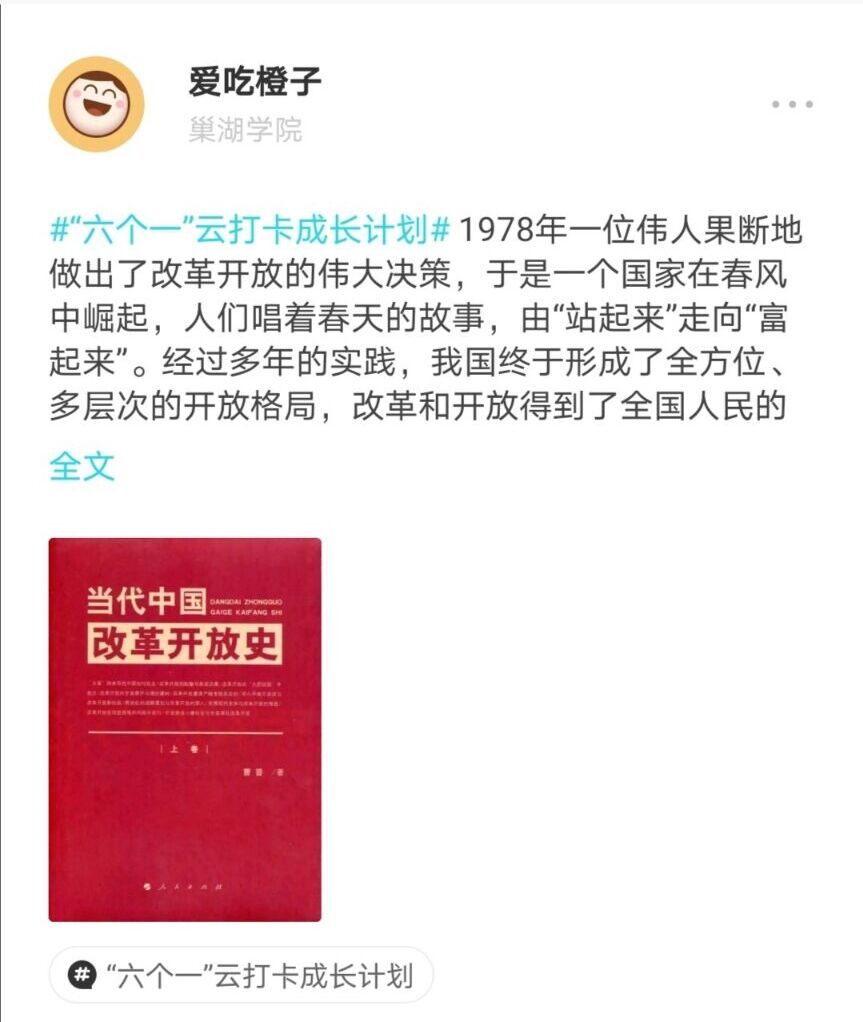 打卡一本“四史”书籍,坚定一份红色信念。习近平总书记指出,历史是最好的教科书,也是最好的清新剂。历史就是一面镜子,不仅照亮了现实,也照亮了未来,通过对党史的学习,我们才能更好的了解过去,明确前进的方向。信息工程学院积极组织学生打卡阅读“四史”书籍,深刻了解中国共产党为了实现中华民族伟大复兴的历史使命,体会到中国共产党在革命和奋斗中的艰难历程。