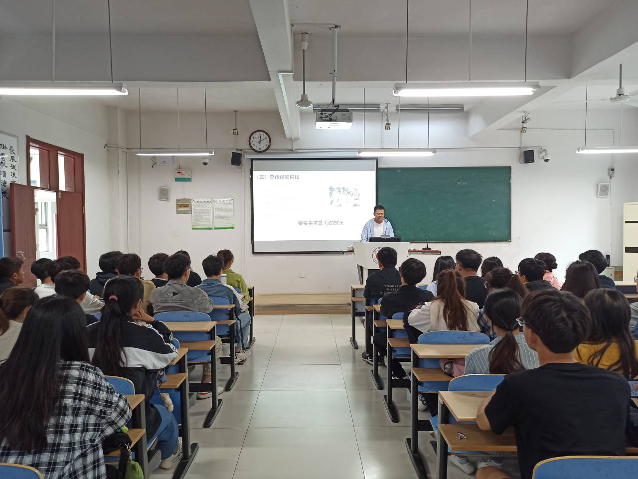 高鹏飞从中国共产党在历经14年的抗日战争中的艰辛历程和最终取得胜利的原因等方面展开,引出本次宣讲会的主题——延安整风,鼎力自强。他谈及延安整风有着深刻的历史背景,1935年1月的遵义会议肯定了“党中央的政治路线无疑义是正确的”,推动了全党的团结和统一,使党成为领导抗日战争和伟大社会革命的坚强核心。他介绍道,在充分酝酿和准备的基础上,延安整风于1942年正式拉开了帷幕。延安时期的全党整风运动按毛泽东的部署,大体可划分为思想动员阶段、整顿三风阶段和总结经验阶段三个阶段。宣讲会接近尾声时,高鹏飞呼吁参会学生应共同学习延安整风的现实意义,作为新时代的大学生,我们应学习毛泽东同志马克思主义中国化的经验,更要学习共产党坚定不移、艰苦奋斗的革命精神。
