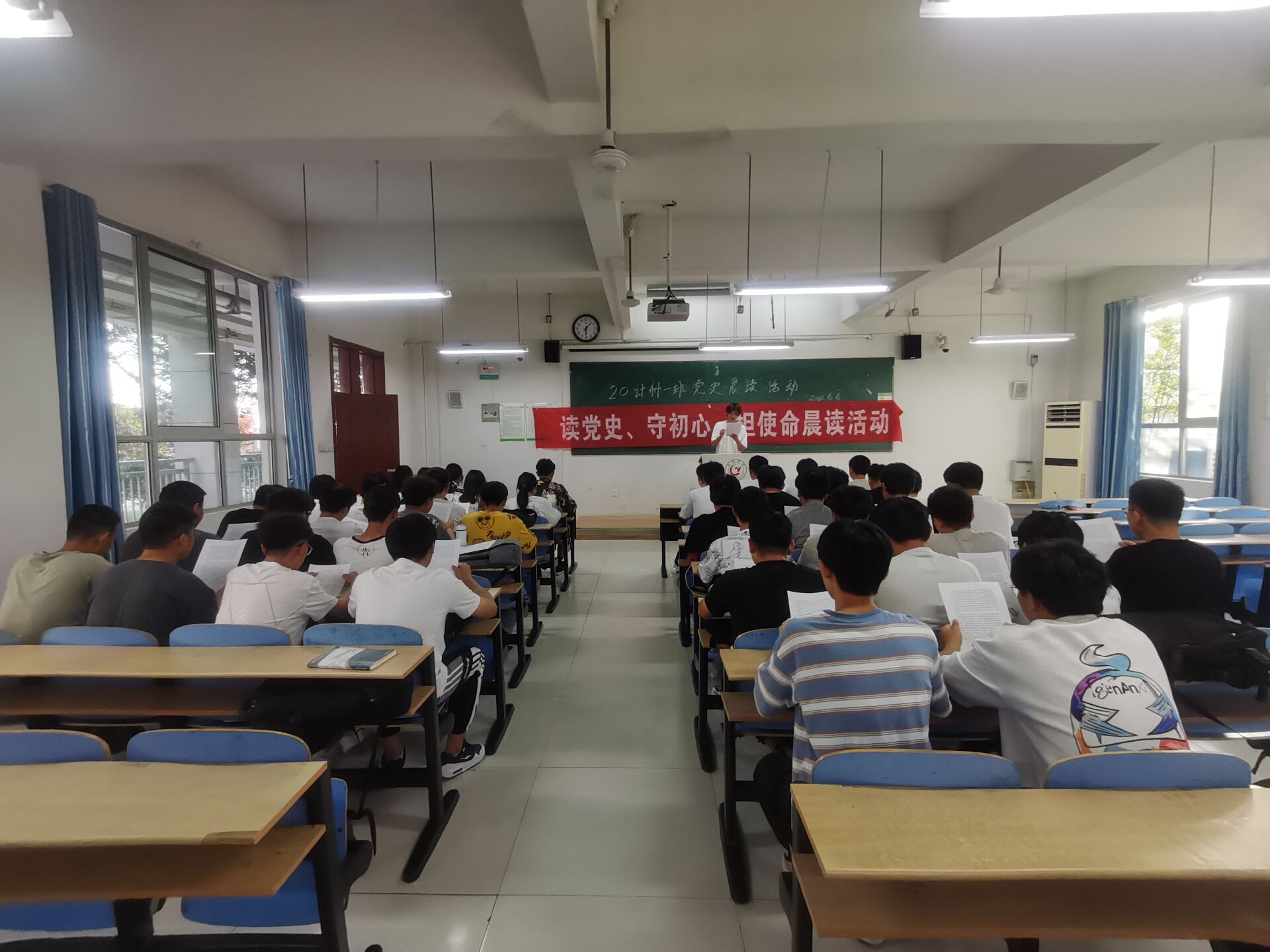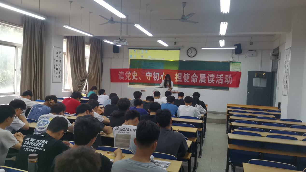 晨读之初,由各班晨读负责人向在座学生简单介绍晨读活动的相关内容,此次晨读活动主要为带领学生集体诵读党史。随后,各班晨读负责人带领大家从“中国共产党的成立”一章开始读起,“从浙江嘉兴南湖上的一条小小红船到领航中国的巍巍巨轮,中国共产党走过百年历程......”。学院学生在朗读过程中缅怀革命历史,重温红色记忆,汲取革命先辈们勇往直前、永不放弃的精神力量,使党史教育和红色基因内化于心,外化于行,不断弘扬老一辈革命家谦虚谨慎、不骄不躁、艰苦奋斗的优良作风,始终保持奋发有为的进取精神。本次“读党史、守初心、担使命”晨读活动旨在弘扬红色文化精神、传承红色基因,增进学院学生对党的热爱,增强个人爱国主义情怀,鼓励学院学生积极投身于中国特色社会主义建设的伟大实践中。