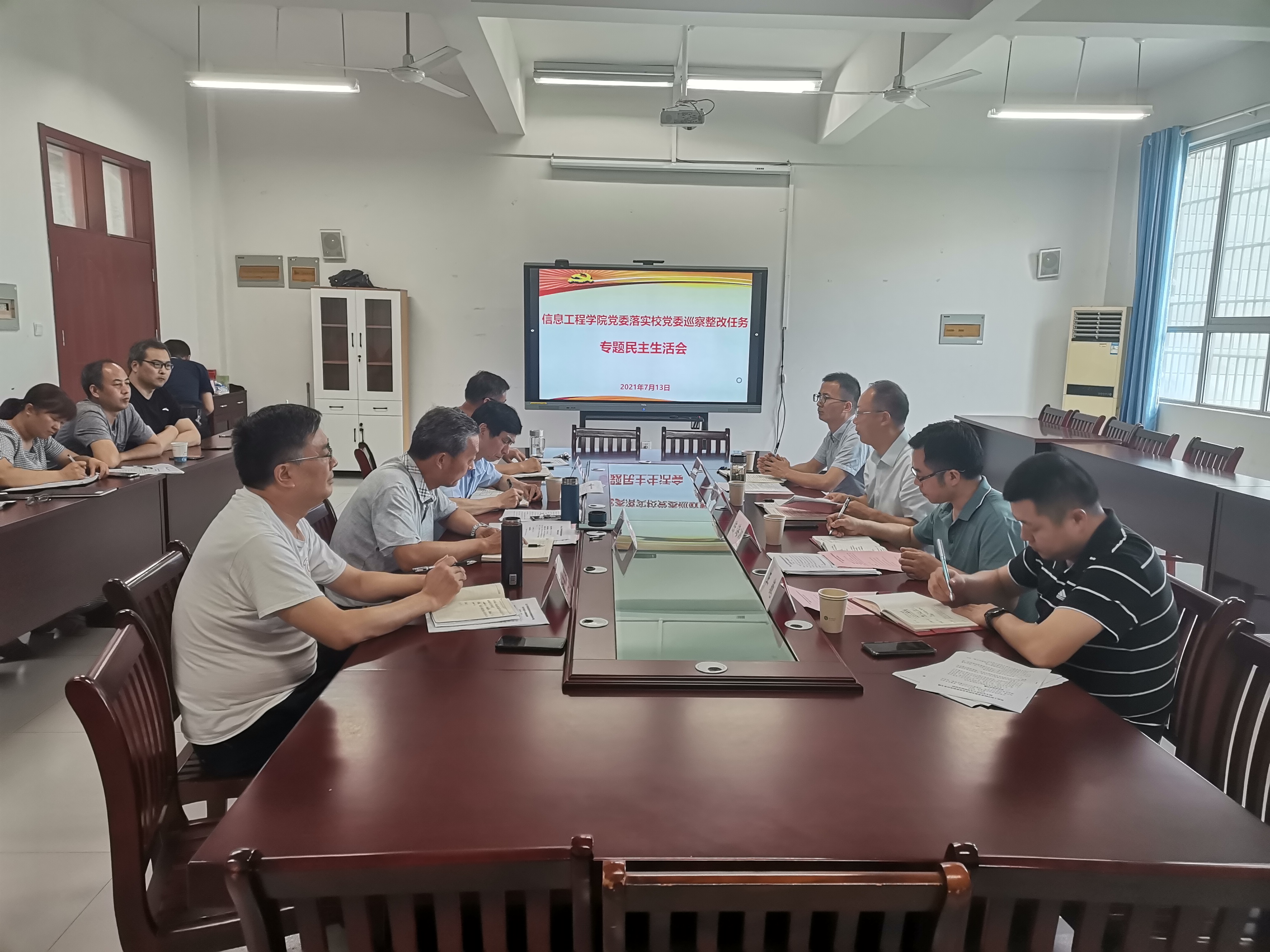 7月13日下午,信息工程学院党委在学院会议室召开落实校党委巡察整改任务专题民主生活会。校党委副书记、校长祝家贵,校党委巡察办公室主任、第二巡察组组长陈海波,校审计处副处长、第二巡察组副组长彭正生,校党委巡察办公室秘书、第二巡察组联络员王巍到会指导。学院班子成员、党委委员、支部书记、科级干部、教研室主任、相关问题整改责任人参加会议,会议由学院党委书记陈士群主持。