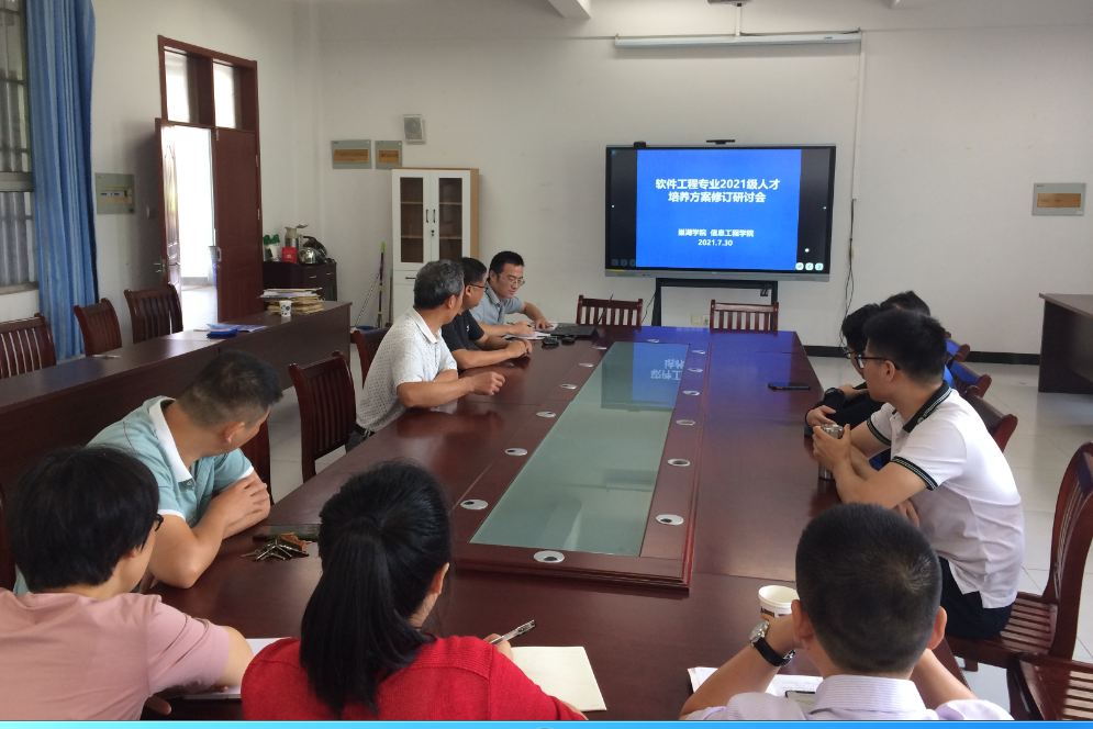 为落实立德树人根本任务,深化教育教学改革,创新人才培养机制,全面提升软件工程专业人才培养质量,7月30上午,信息工程学院召开软件工程专业2021级人才培养方案修订研讨会。会议由教研室主任张勇主持,信息工程学院院长郑尚志,党委书记陈士群,副院长吴其林及全体教研室成员参加会议。