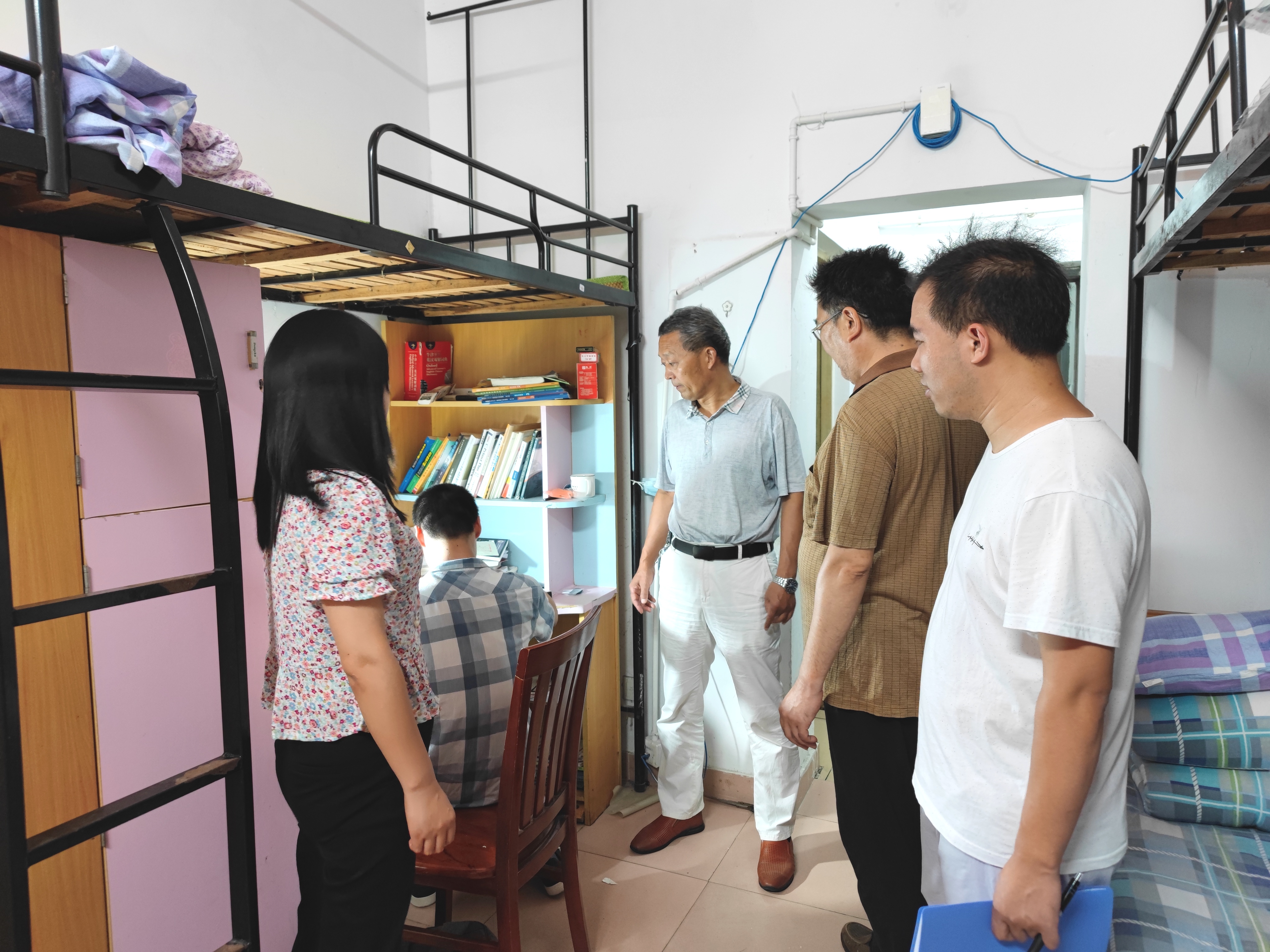 9月12日晚,信息工程学院党委书记陈士群、副书记童先军带领樊乐乐等辅导员,走访新生寝室,亲切看望刚刚入学的2021级新生,给新同学带去问候与关心。