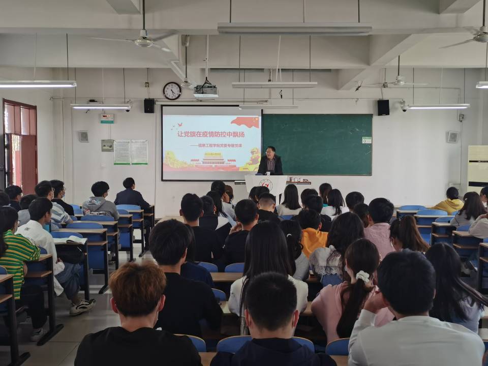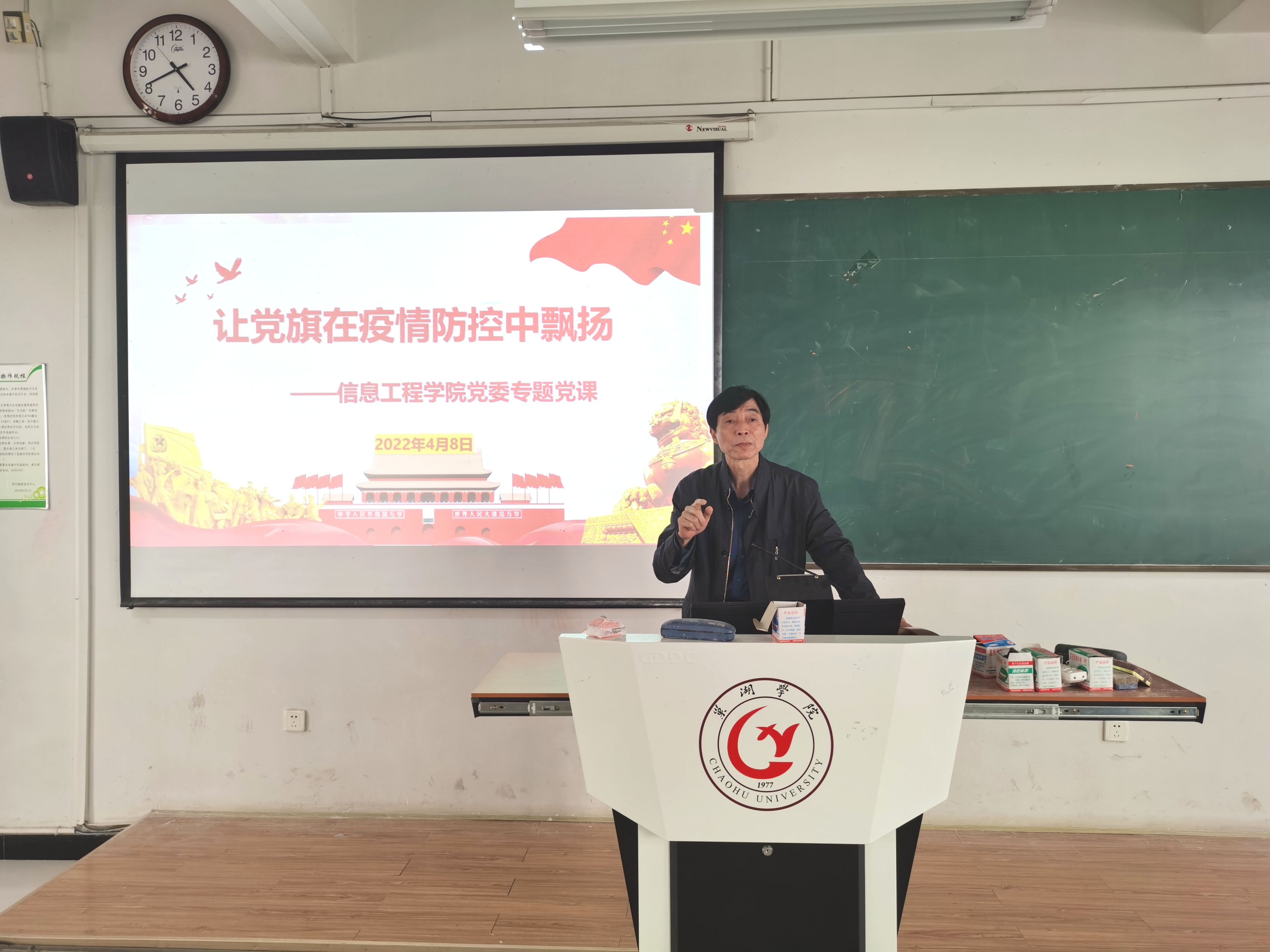 为进一步宣传疫情防控政策,落实疫情防控工作要求,4月8日下午,校党委委员、院党委书记郑尚志代表学院党委走进学生支部,为学院全体学生党员开讲了《让党旗在疫情防控中飘扬》的主题党课,本次党课活动由院党委副书记童先军主持,信息工程学院各学生支部党员参加。