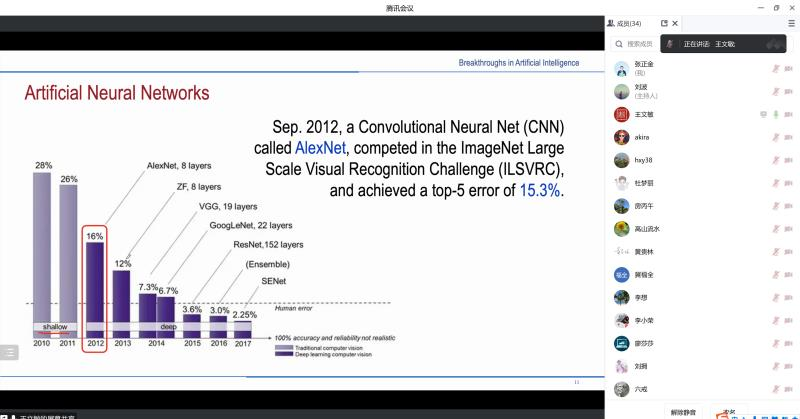 本次学术报告晚上7点30分在腾讯会议上准时开始,吴其林教授首先对王教授表示了热烈的欢迎,并简单介绍了王教授的学术经历。之后,王教授开始正式的学术报告,王教授的报告深入浅出,他首先全面系统地介绍了人工智能的诞生及发展历程,然后从系统体系的角度阐述了对人工智能的理解和思考,此外,王教授还结合当下流行的chatGPT等人工智能新兴技术进一步提出了对人工智能发展方向的思考。会议内容充实饱满,引人思考。王教授报告完后,吴其林教授对本次报告做了简短总结。