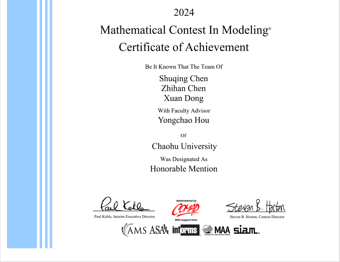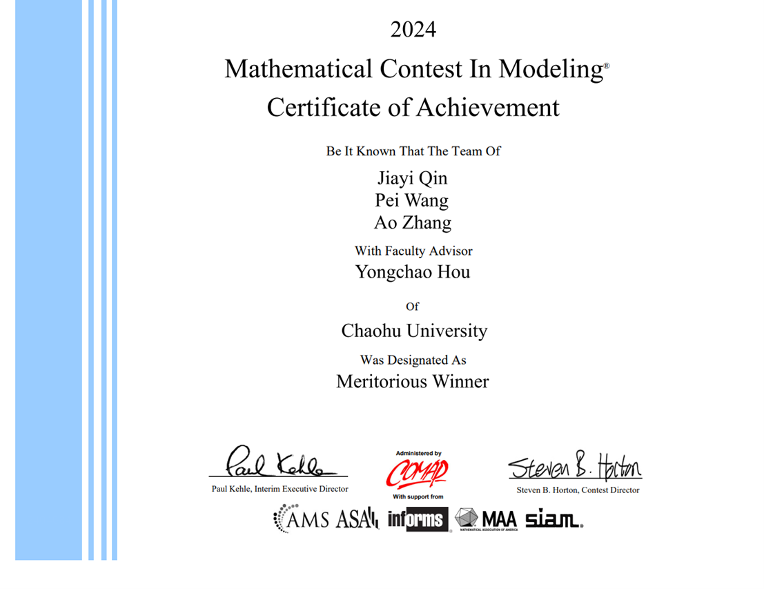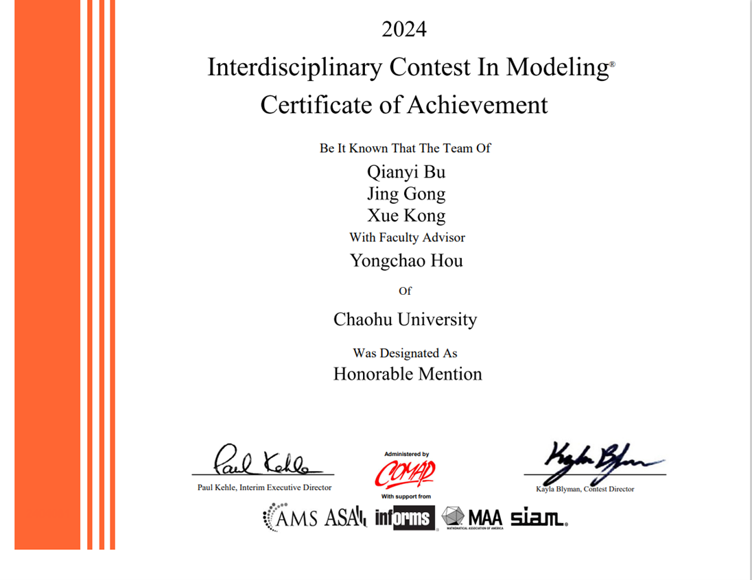 近日,2024年美国大学生数学建模竞赛(Mathematical Contest in Modeling/ Interdisciplinary Contest in Modeling, MCM/ICM)成绩正式揭晓。此次比赛必赢76net官网共遴选出5支队伍参加比赛,在全体参赛队员与指导教师的奋力拼搏下,在获奖等级和数量上均取得历史性突破。其中,首次获得国际一等奖(Meritorious Winner,获奖率为6.66%)1项(秦家怡、王佩、张傲)、首次获得国际二等奖(Honorable Mention,获奖率为23.06%)2项(陈淑晴、陈芷晗、董璇;卜前亿、孔雪、宫静),使得我们在二等奖及以上奖项获奖率达60%,远超全球31.6%的获奖率。