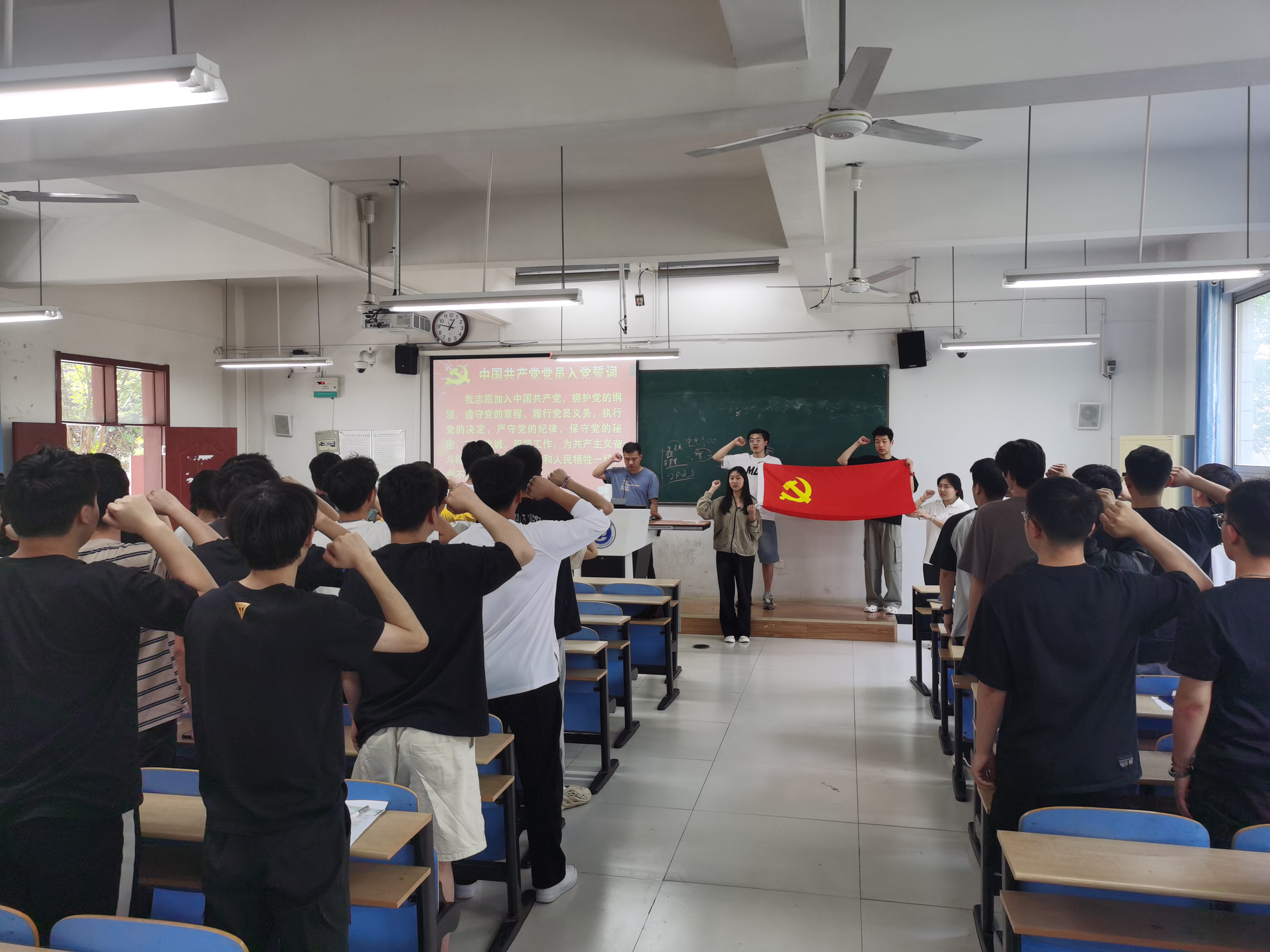 最后,全体党员面对鲜红的党旗,举起右拳,重温了入党誓词,再次许下铮铮誓言。