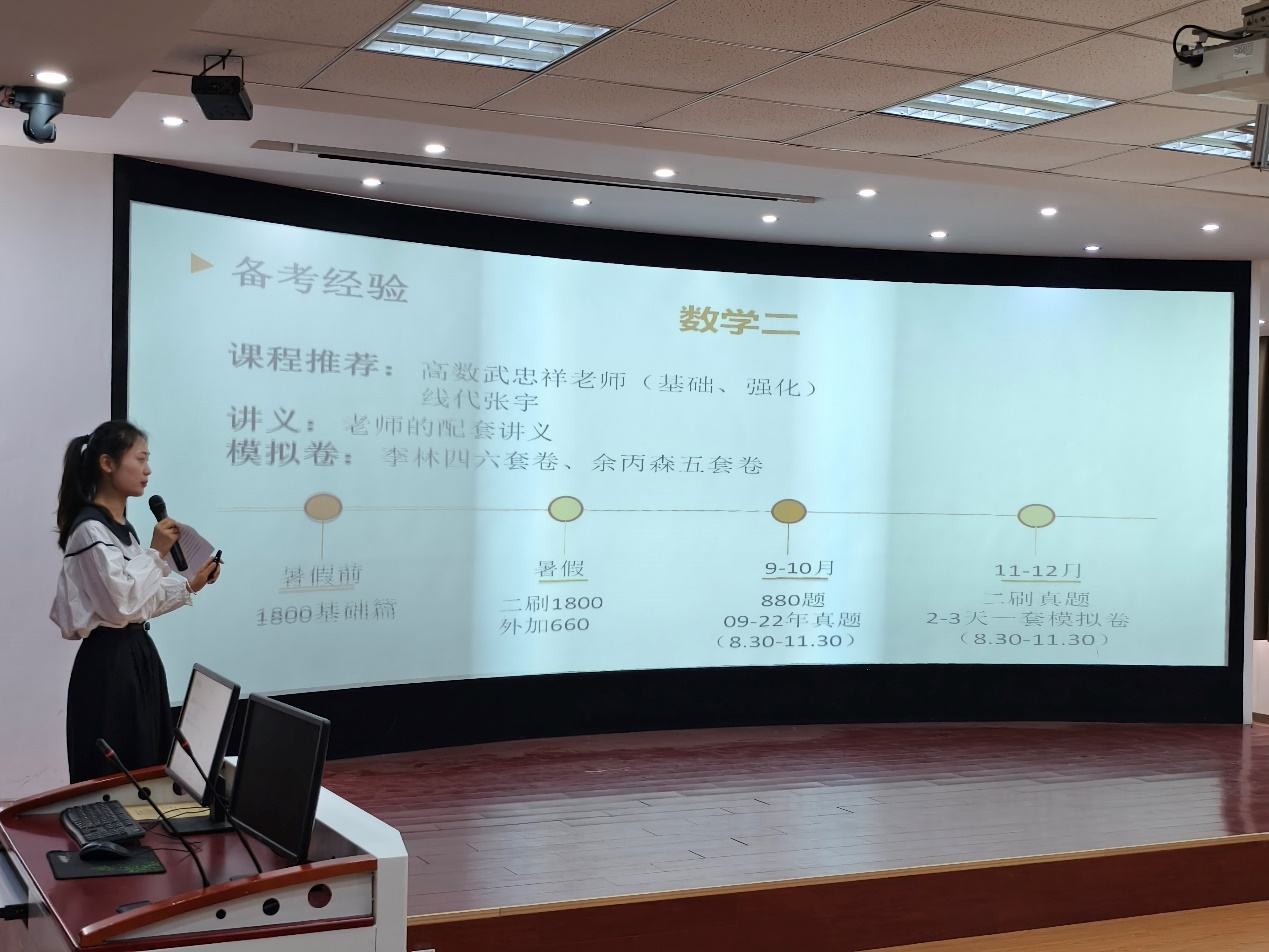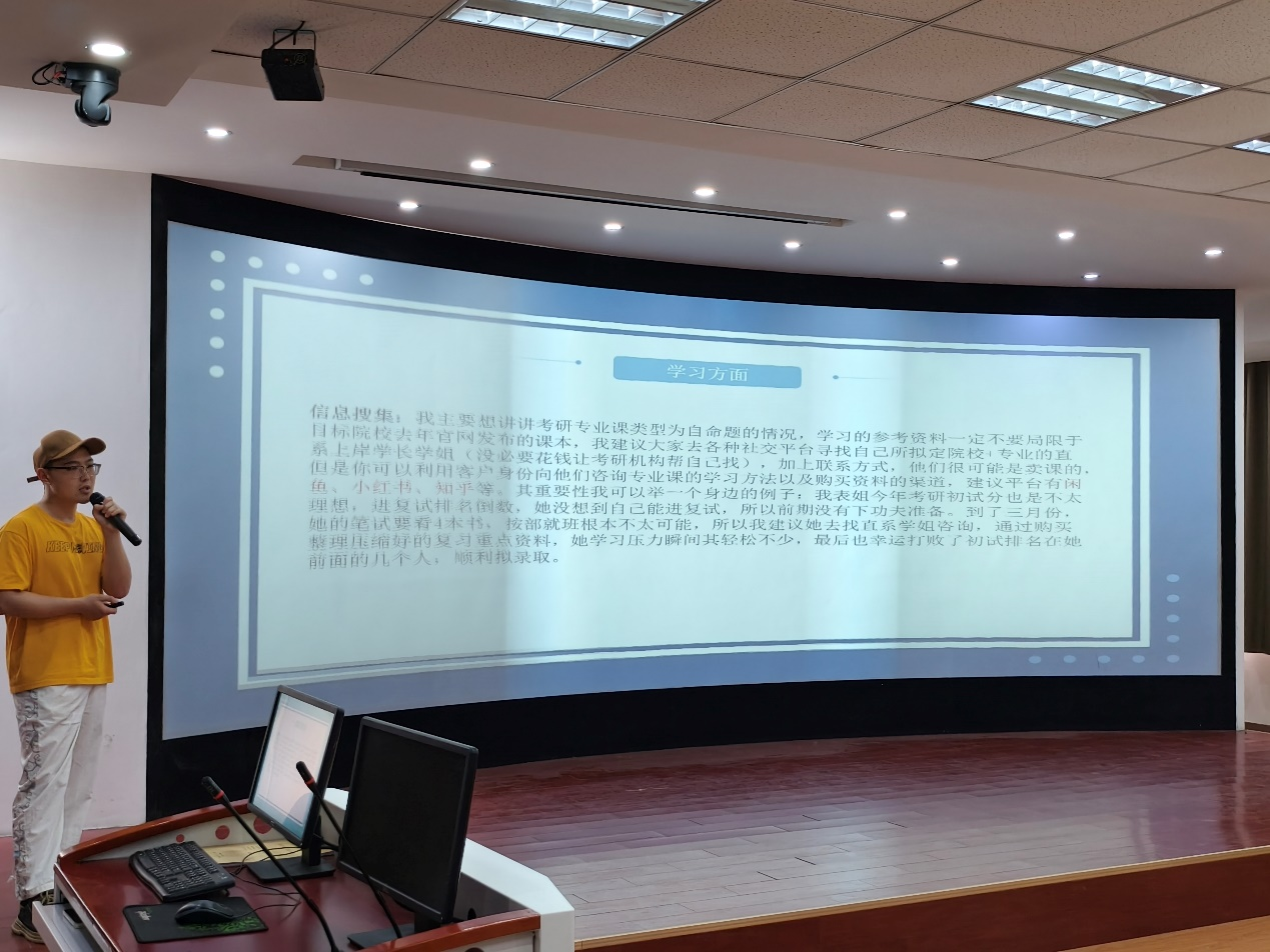 20计科3班陈可云,分享了各科目备考的学习方法和复习策略,特别强调了基础知识的重要性。20物工2班张朝科,从如何选择考研学校和专业分享了心得,指出选择适合自己的学校和专业比盲目努力更为关键。20计科3班王奕哲,分享了许多实用的考研资源,包括网课、文章和其他学习材料。20软工1班方龙楷,就备考过程中如何保持良好心态和调整备考状态分享了技巧,同时提醒同学们在备考过程中要劳逸结合,避免过度焦虑,保持健康的心理状态。