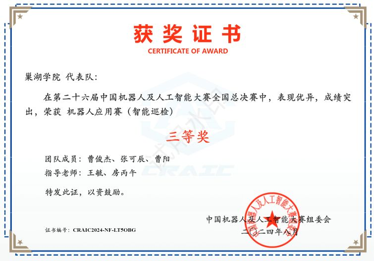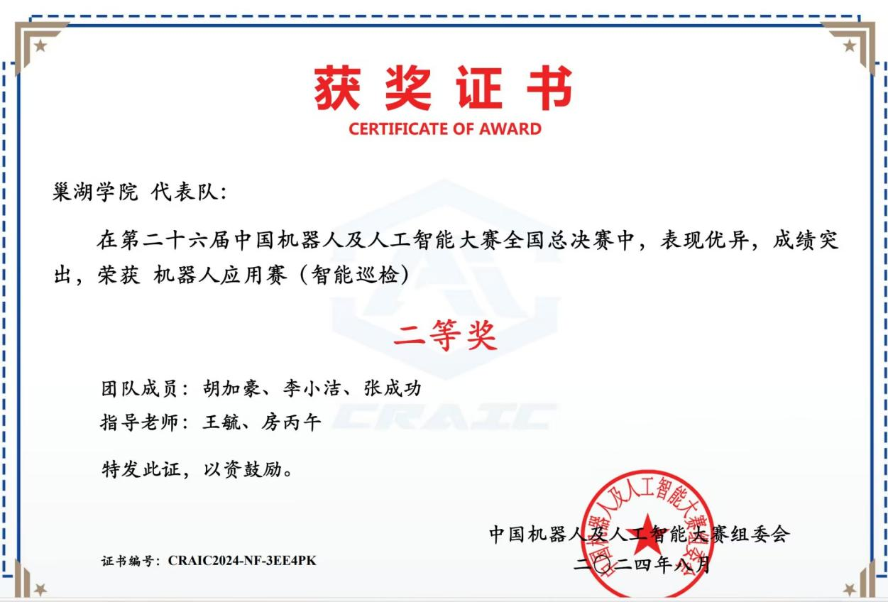近日,第二十六届中国机器人及人工智能大赛成绩公布。我校学子获得全国总决赛二等奖一项、三等奖一项,获奖队员来自计算机与人工智能学院22级人工智能班胡加豪、曹俊杰;23级人工智能班李小洁、张成功、张可辰;23级计算机科学与技术班戴礼;23级物联网工程班曹阳。
