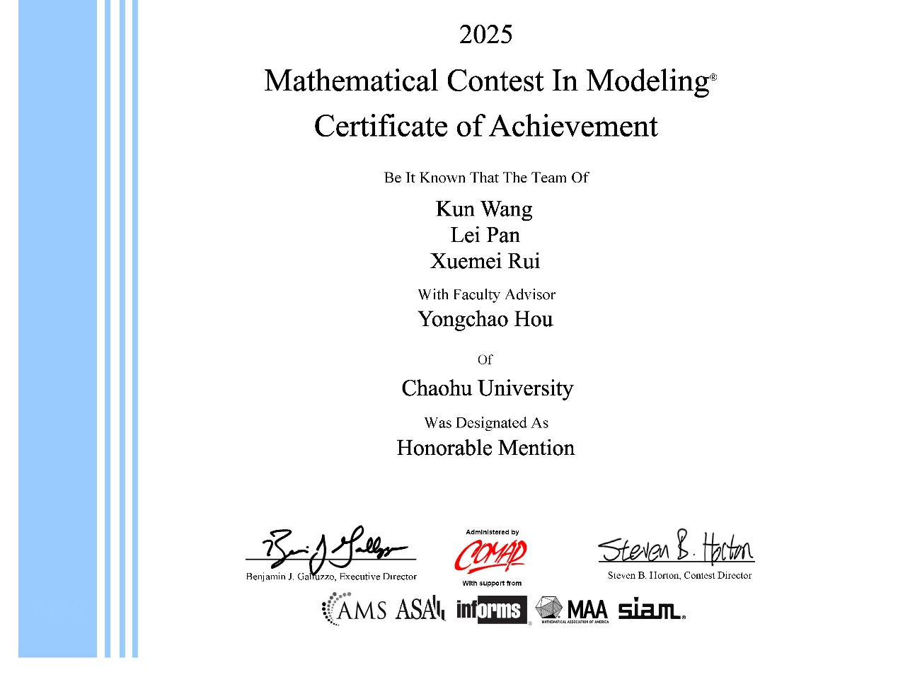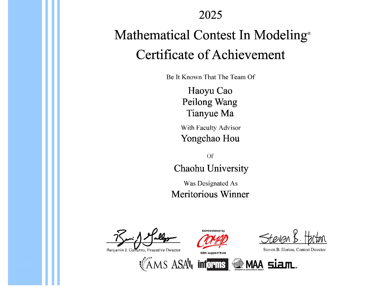 近日,2025年美国大学生数学建模竞赛和交叉学科建模竞赛(MCM/ICM)成绩揭晓。必赢76net官网学子在本届竞赛中斩获佳绩,共获得国际一等奖(Meritorious Winner)1项(获奖团队:曹浩宇、王佩龙、马天悦),国际二等奖(Honorable Mention)4项(获奖团队:王坤、潘磊、芮雪梅;邓伍健、徐卓、王胜;周鑫宇、杜志杰、彭真;李乐熙、柳梦蝶、韦秋冉),获奖总数创历史新高,同时学校也实现了连续两年获得该赛事国际一等奖的突破。