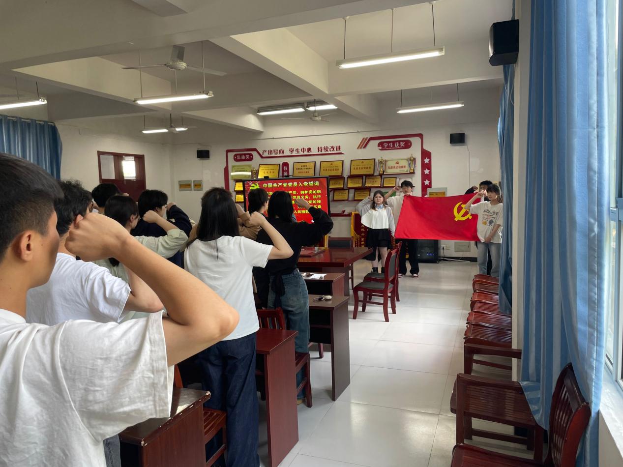 最后,全体毕业生党员面对鲜红的党旗,庄严地重温入党誓词,再次许下铮铮誓言。