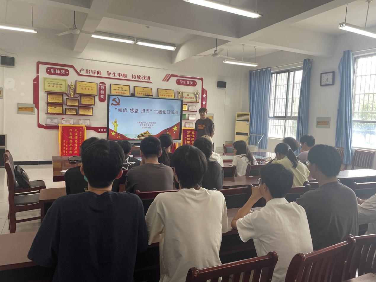 学院通过挖掘和宣传身边可信、可学的励志典型,发挥先进榜样的励志示范引领作用。学生第五党支部以“诚信 感恩 担当”为主题开展党日活动。在国际数学建模竞赛中获得一等奖的学生党员王佩龙围绕学业规划、学科竞赛等方面,分享大学三年的成长与感悟。他认为,诚信是学术竞赛的基石,感恩是成长的阶梯。三年来,每一次获奖都源于对规则的坚守,更离不开师长的指导和学校的培养,未来将以所学投身科技报国,反哺社会。