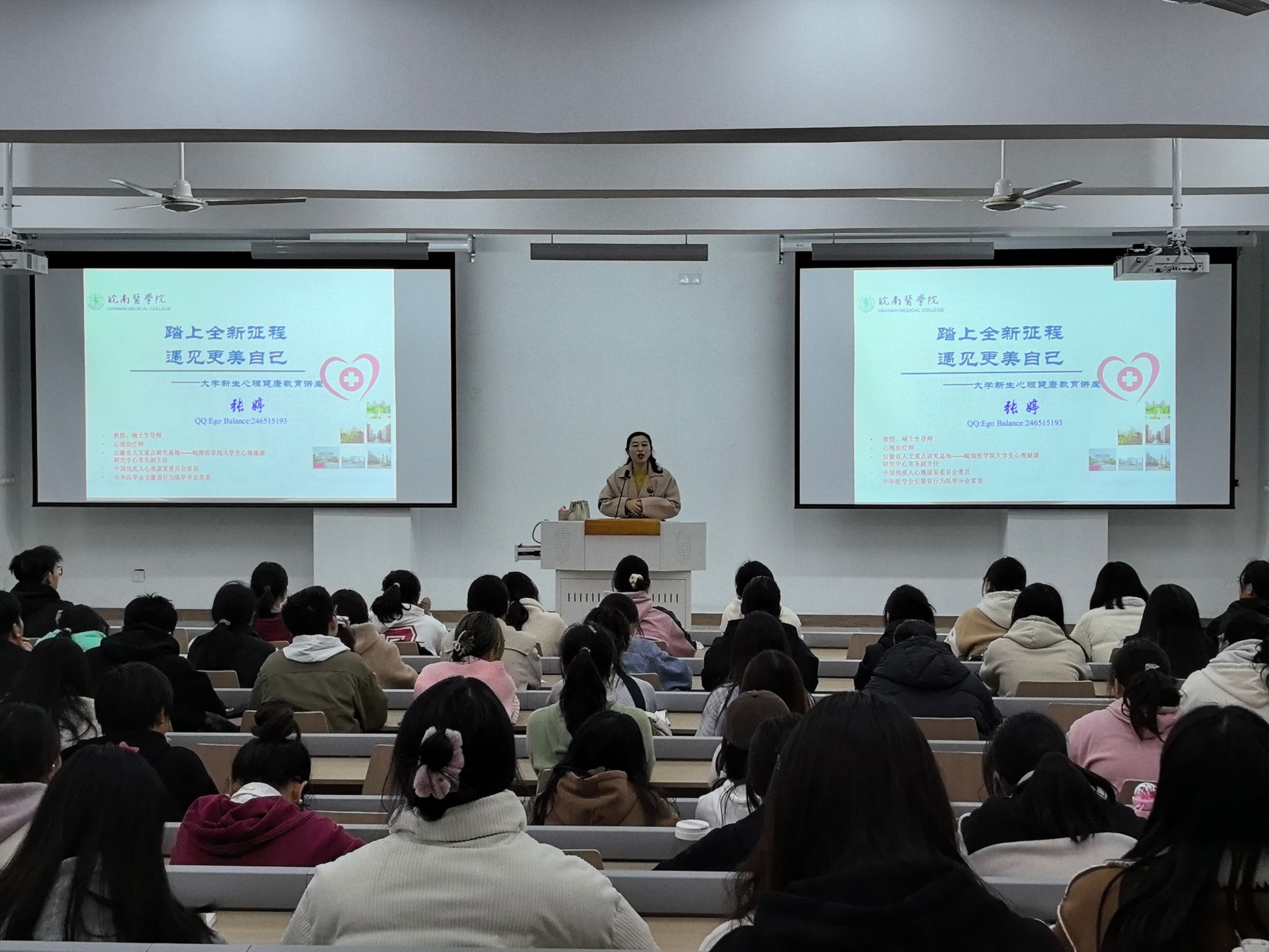张婷教授结合自身多年的从教和从事心理咨询与治疗的丰富经验,同与会新生共话“美好心灵”。语言风趣幽默、案例贴近实际,生动展示了“心理学人”的强大“共情”能力,赢得了现场阵阵热烈掌声,给新校区踏上新起点的新生们分享了智慧、带来了温暖、增添了信心。
