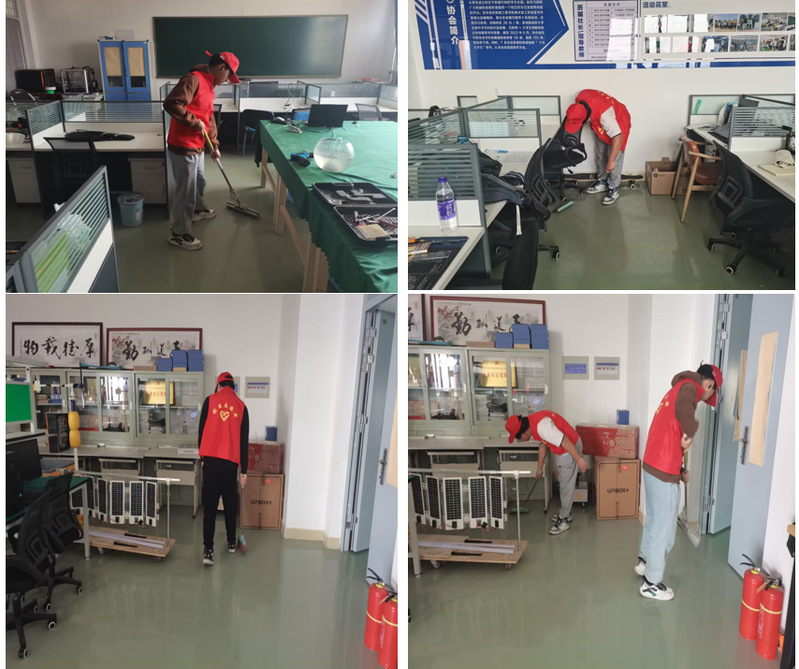 理论学习结束后,学生党员分小组各实验室,开展清扫整洁活动,对实验室卫生死角进行了清理,确保做到不漏卫生死角,整一处、清洁一处、靓丽一处。