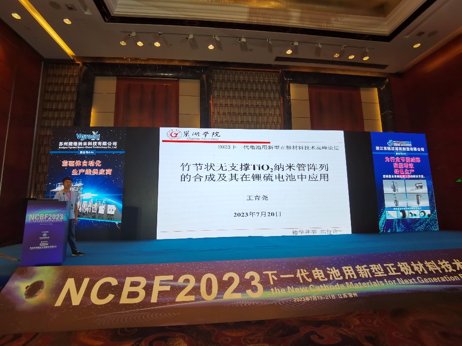 王青尧博士在会上作了“竹节状无支撑Ti02纳米管阵列的合成及其在锂硫电池中应用”的报告,阐述了Ti02纳米管的不同阵列形式对锂硫电池工作性能和安全性的影响,并和与会者进行了深入的交流。