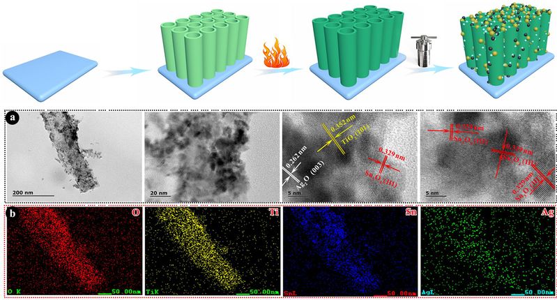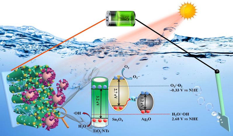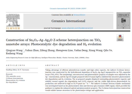 近日,我校机械工程学院王青尧科研团队在国际材料领域top期刊《Ceramics International》上发表了题为“Construction of Sn3O4–Ag–Ag2O Z-scheme heterojunction on TiO2 nanotube arrays: Photocatalytic dye degradation and H2 evolution”的研究论文。该刊物创刊于1981年,主要接收包括陶瓷、玻璃等无机非金属材料以及其工艺相关主题的文章,为中科院大类一区期刊,影响因子为5.13,为世界权威材料科学刊物之一。