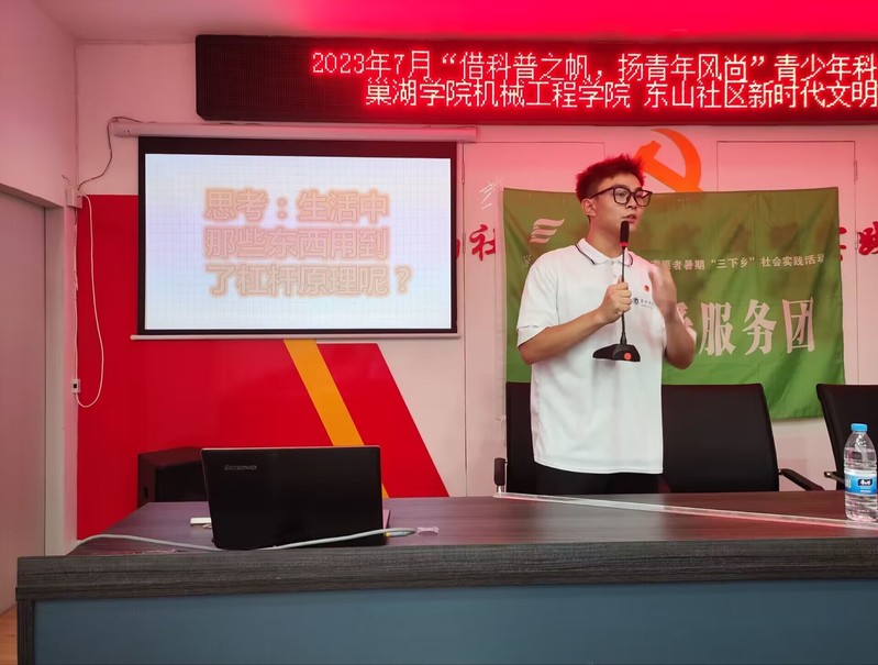 “青志愿”团队前往第二站东山社区。机械课队员肖劲轩介绍了什么是机械?用生活中的例子展示机械带来的便利。他从简单机械出发,利用学科优势,给小朋友们普及了相关专业知识,接着他用“杠杆原理”和“定滑轮原理”的理论,用两个小实验验证,小朋友们豁然开朗。课间,还和小朋友们进行了互动交流。激发了青少年对机械相关知识的兴趣。
