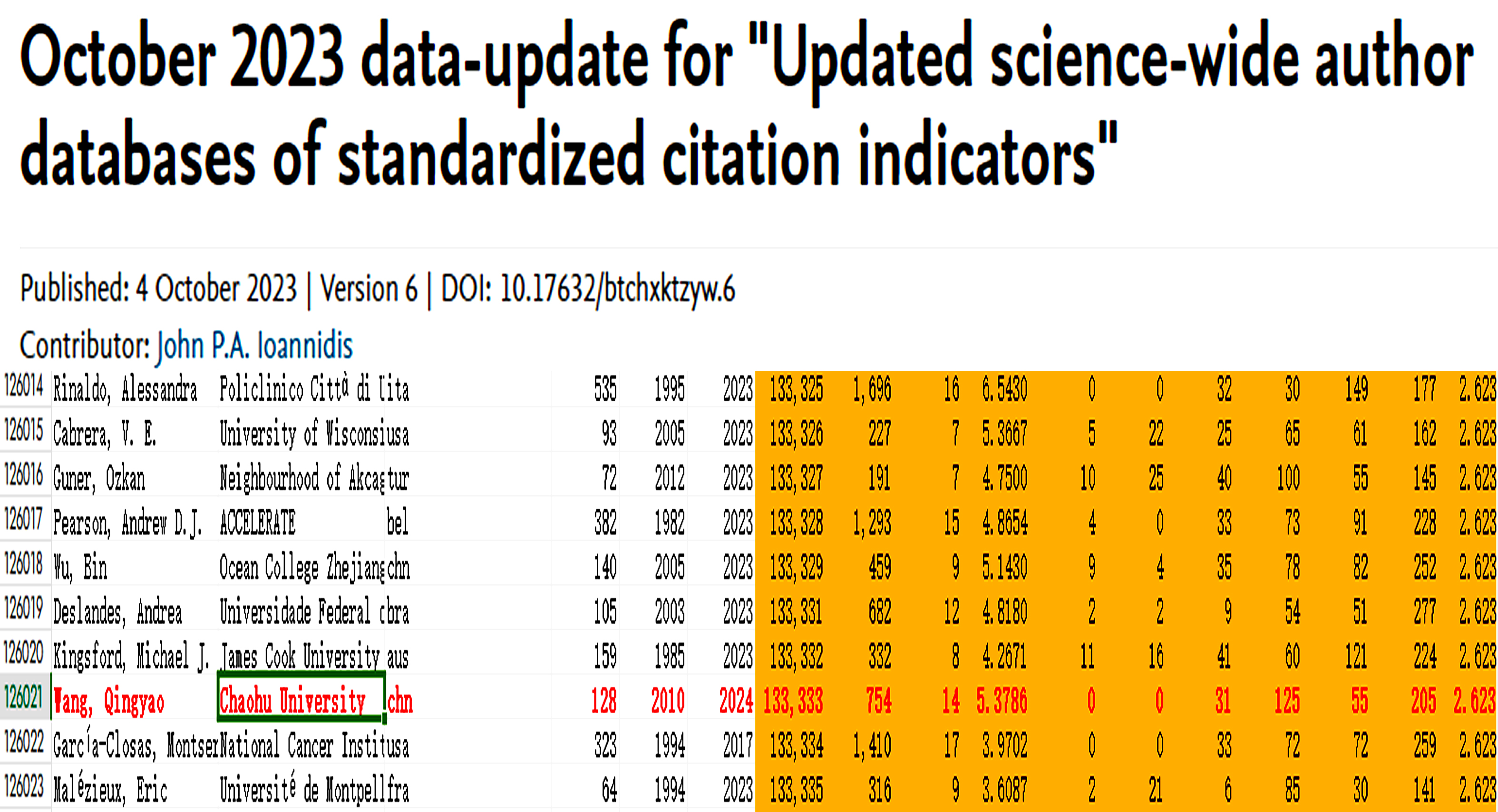 近日,美国斯坦福大学发布了2023年全球前2%顶尖科学家榜单(World's Top 2% Scientists 2023),机械工程学院王青尧博士入选“2023年度科学影响力排行榜”。美国斯坦福大学全球前2%顶尖科学家榜单是Elsevier和斯坦福大学John P. A. Ioannidis教授团队联合发布,为全球学术界提供一个面向科学家长期科研表现的衡量指标,旨在更客观、更真实地反映科学家全球影响力。