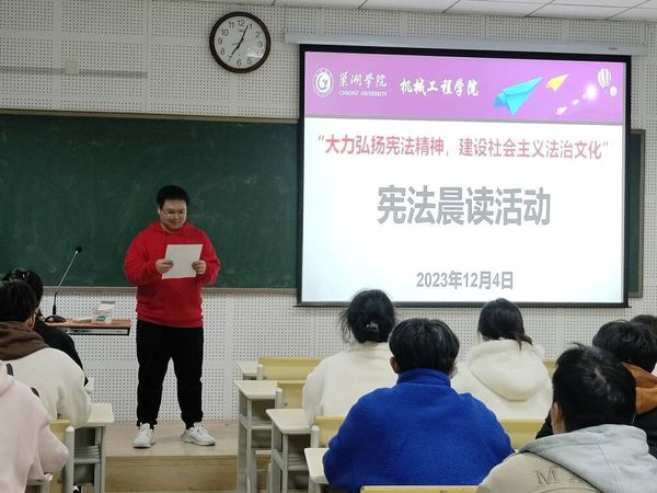 2023年12月4日是我国第十个国家宪法日。为深入学习贯彻党的二十大精神和习近平法治思想,教育引导广大学生听党话、跟党走,12月4日至12月8日早晨7︰00至7︰50,机械工程学院组织2023级各班学生在第一田径运动场接力开展“砥砺奋进新征程 不负青春勇担当”晨读活动。