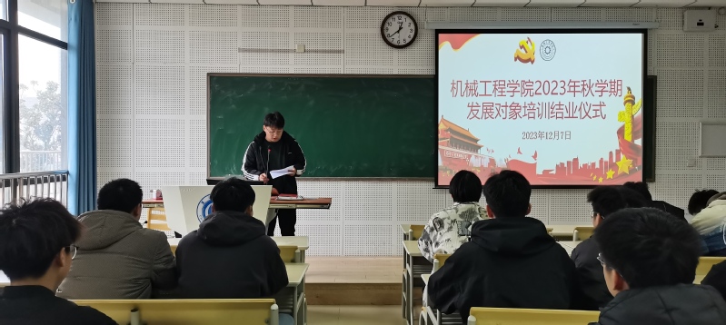 2023年12月7日,机械工程学院举办2023年秋学期发展对象培训结业仪式。学院党委党校培训班班主任方钱、学生支部书记苏洁红、王靖国及参加本次培训的50名发展对象参加了结业仪式。