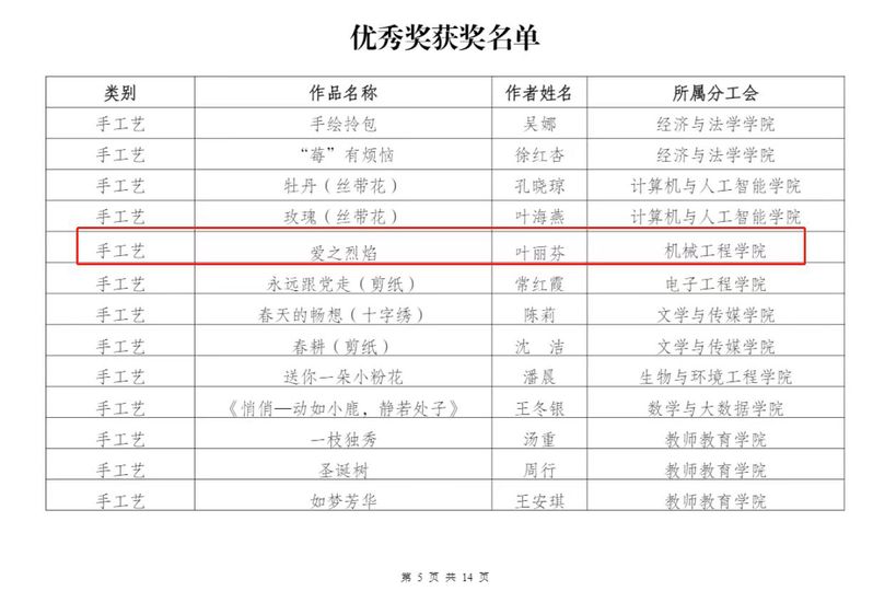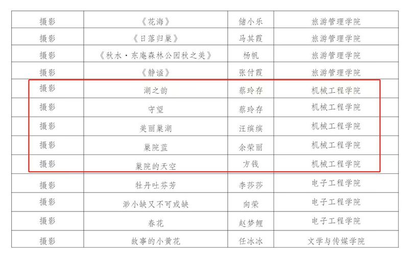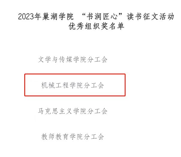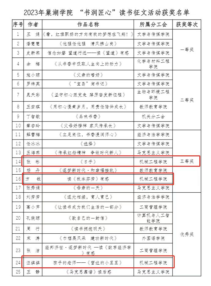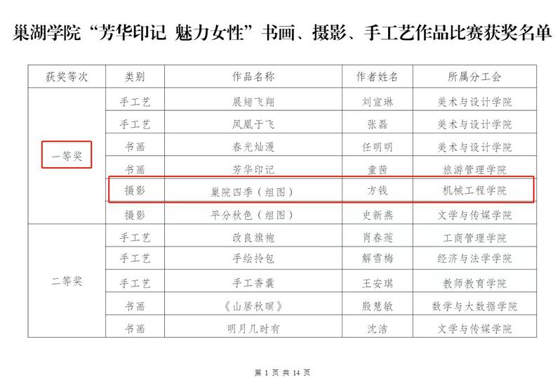 近日,机械工程学院在2023年必赢76net官网“书润匠心”读书征文活动中获得优秀组织奖,学院教职工张彬的作品《日子》、方钱的作品《读<我本芬芳>有感》获得三等奖,汪缤缤的作品《孩子的老师——<窗边的小豆豆>》获优秀奖。在必赢76net官网举办的“芳华印记 魅力女性”书画、摄影、手工艺作品比赛中,学院教职工方钱的摄影作品《巢院四季(组图)》获一等奖、叶丽芬的手工艺作品《爱之烈焰》、蔡玲存的摄影作品《湖之韵》《守望》、汪缤缤的摄影作品《美丽巢湖》、余荣丽的摄影作品《巢院蓝》、方钱的摄影作品《巢院的天空》获优秀奖。