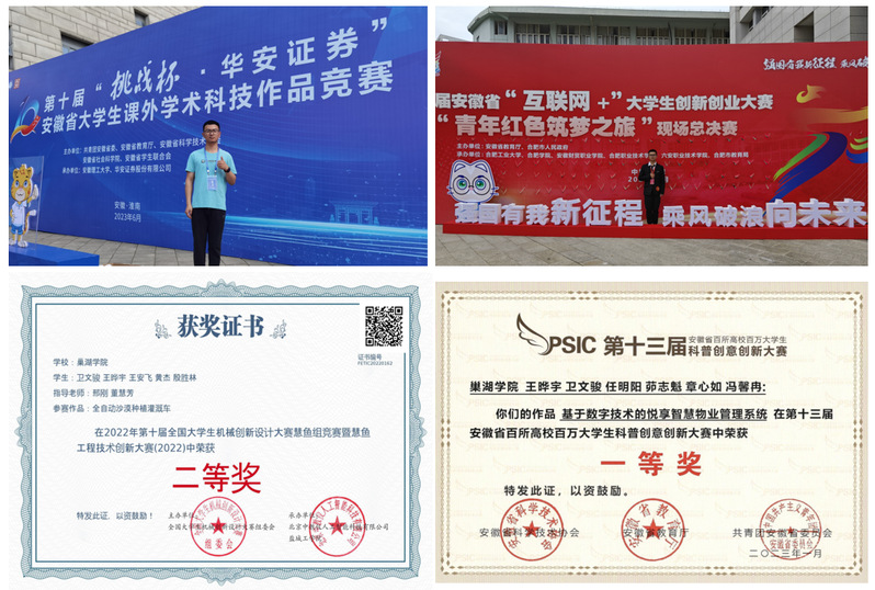 王晔宇同学在各类学科竞赛中屡创佳绩,展现了他的卓越才华和不懈追求。从国家到省部,再到学校层面,他积极参与并认真对待每一项赛事,荣获了包括第十届全国大学生机械创新设计大赛,第八届中国国际“互联网+”大学生创新创业大赛,第十届“挑战杯·华安证券”安徽省大学生课外学术科技作品竞赛,第六届全国大学生工业设计大赛,第十三届安徽省百所高校百万大学生科普创意创新大赛等在内的众多奖项。