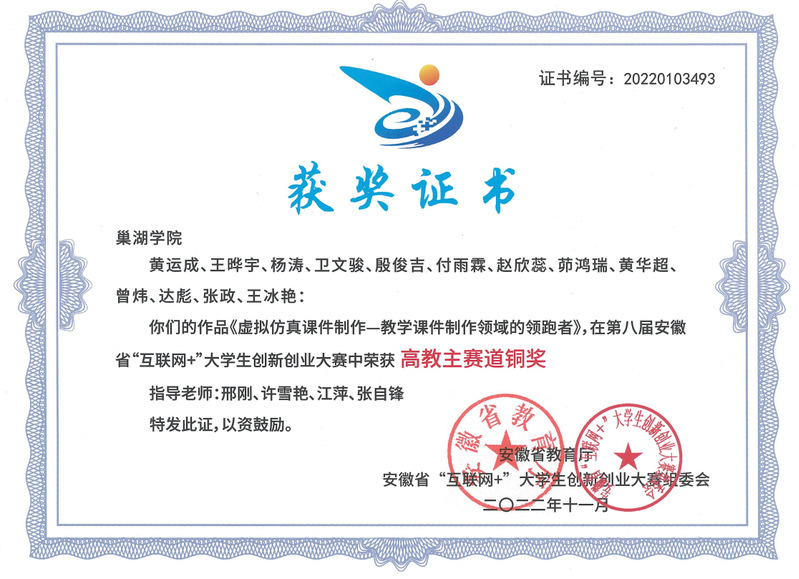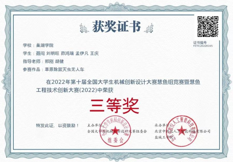 在校期间,积极参加院、校、国家举办的各种活动,曾获第十届全国大学生机械创新大赛全国三等奖、第八届安徽省“互联网+”大学生创新创业大赛省级铜奖等奖项。