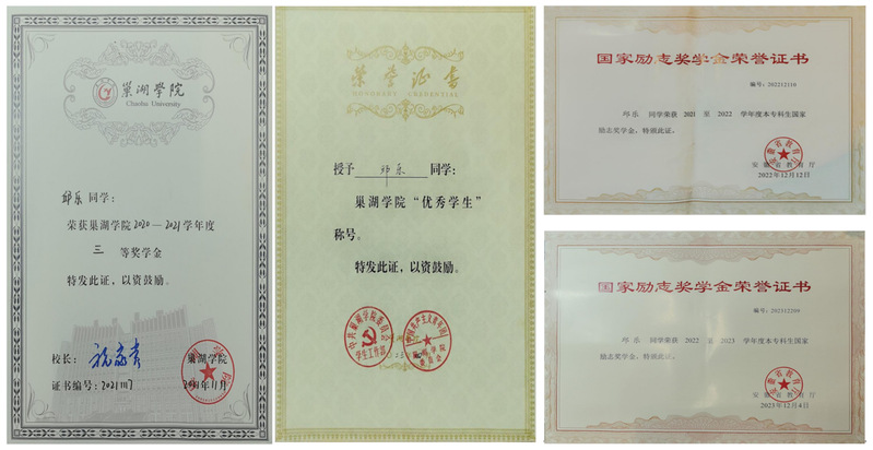 在学习方面,他始终坚持态度端正,刻苦努力,成绩优异。大学四年期间无任何课程挂科,学习成绩、综测成绩排名始终保持在专业前列,不断加强理论知识学习,目标明确,计划周详。专业成绩平均分保持在80分以上,总成绩平均分超过85分,专业课程成绩均保持在90左右,总绩点是3.5。积极参加课内外专业活动拓宽自己的知识层面,注重理论与实践相结合。连续三年获得校级三等奖学金和两次国家励志奖学金,获得校级“优秀学生”称号。