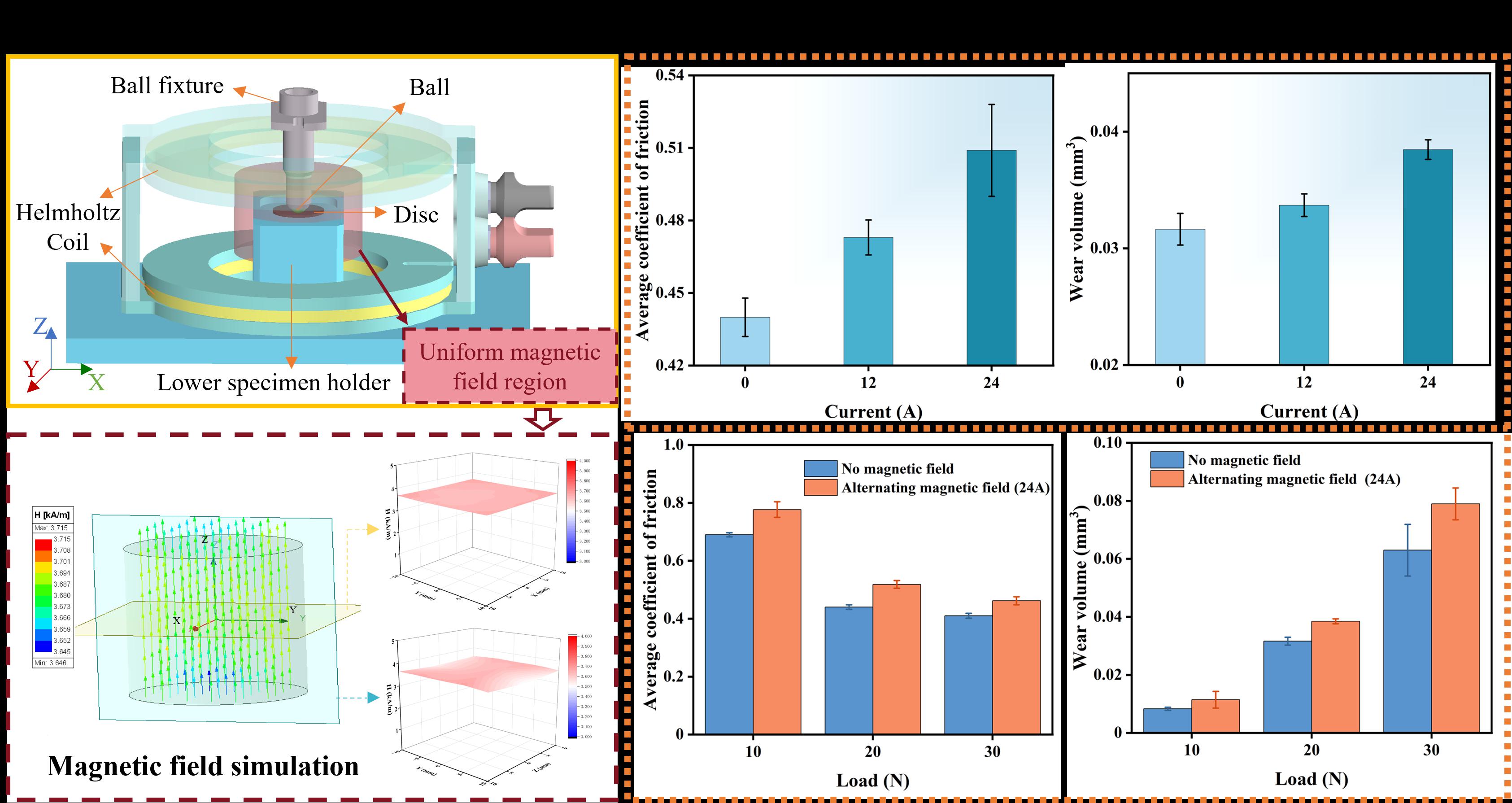 随着高端装备智能化、精密化发展,复杂电磁环境对机械系统关键零部件的摩擦学性能影响已成为制约装备可靠性的共性科学问题。本研究聚焦于交变磁场环境下钢/钢摩擦副的摩擦学行为演化机制,首次系统揭示了磁场强度、载荷及滑动速度多场耦合作用下摩擦系数、磨损率及磨屑形貌的动态响应规律,为解决航空航天、轨道交通等领域轴承材料在电磁干扰下的失效问题提供了理论依据。