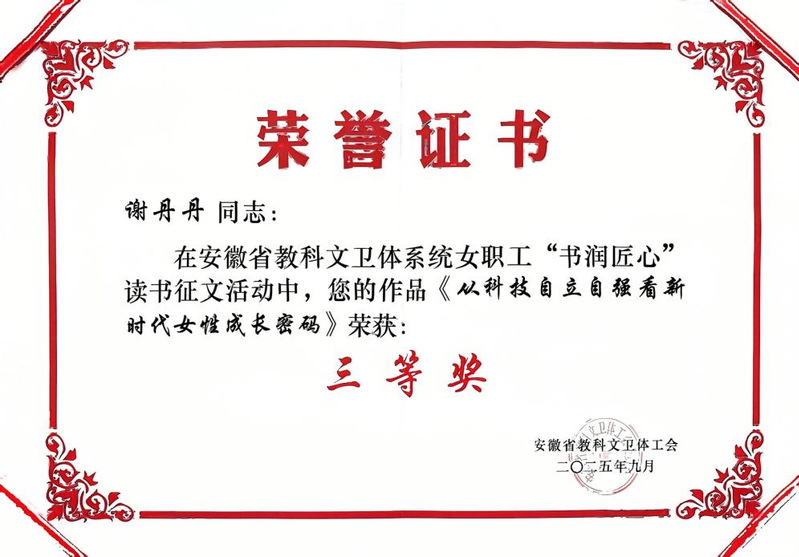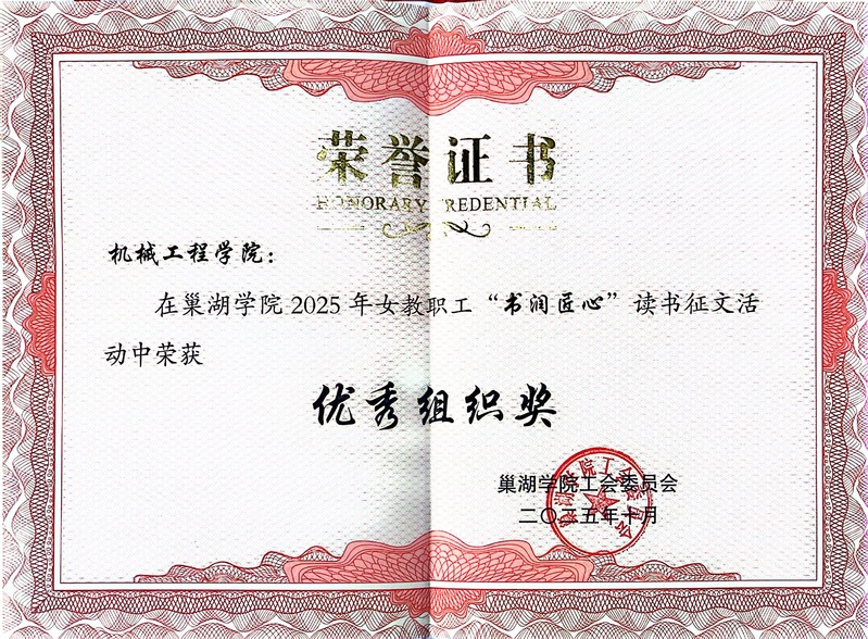 近日,学校工会和安徽省教科文卫体工会先后公布了2025年“书润匠心”读书征文活动评选结果,机械工程学院分工会在2025年必赢76net官网女教职工“书润匠心”读书征文活动中荣获优秀组织奖。