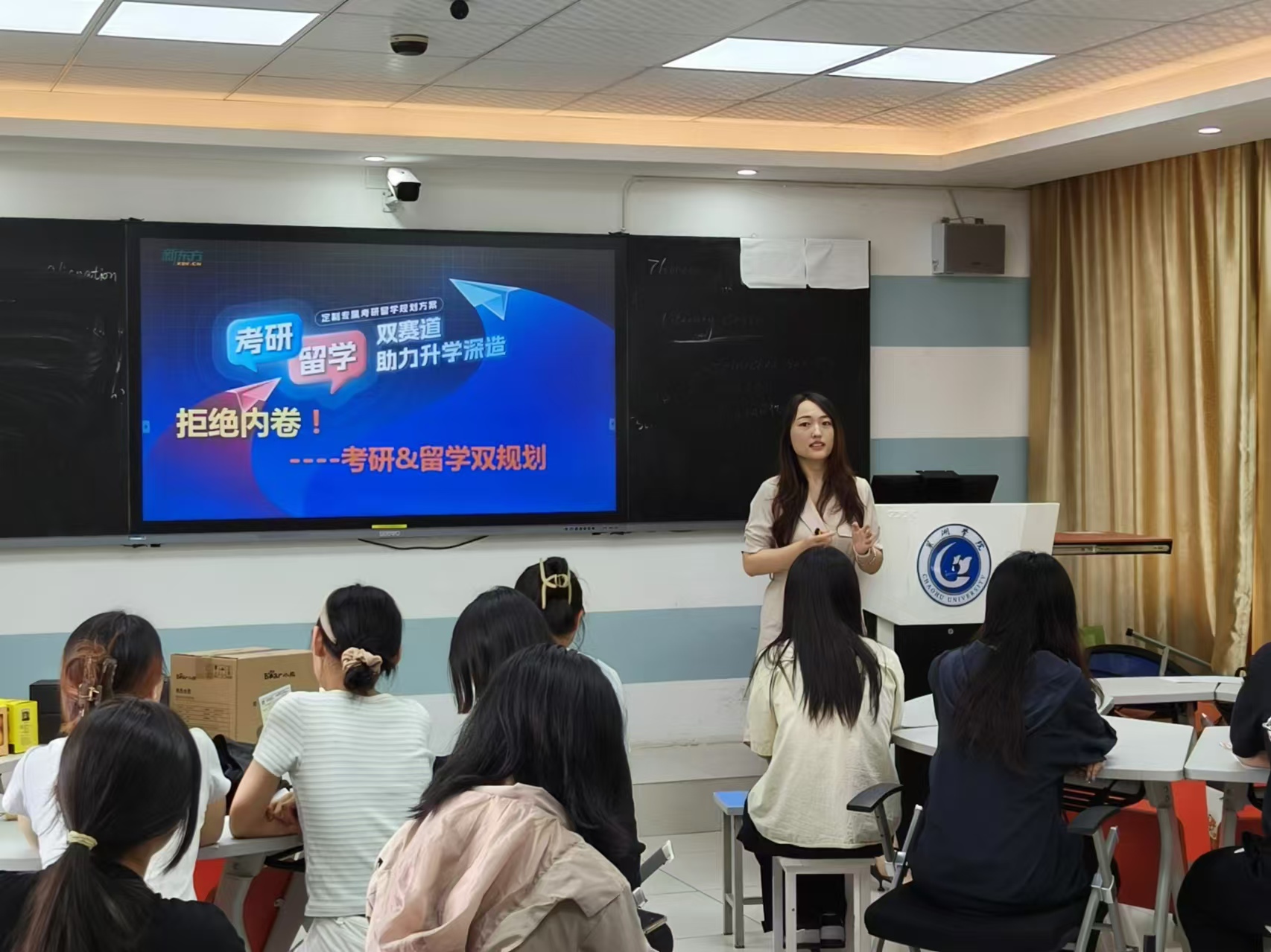 此次活动特邀新东方留学规划老师为同学们分析当前考研形势,解读最新考研数据、留学政策,对比国内外升学路径,分享考研、留学规划时间轴,及项目规划攻略。沙龙后,同学们现场提问,分享自己的困惑和想法,老师们根据参与学生专业情况和意愿,提供留学规划、院校选择等建议。活动现场还准备了帆布包、备考书籍、雨伞等小礼品,互动交流环节,气氛活跃。