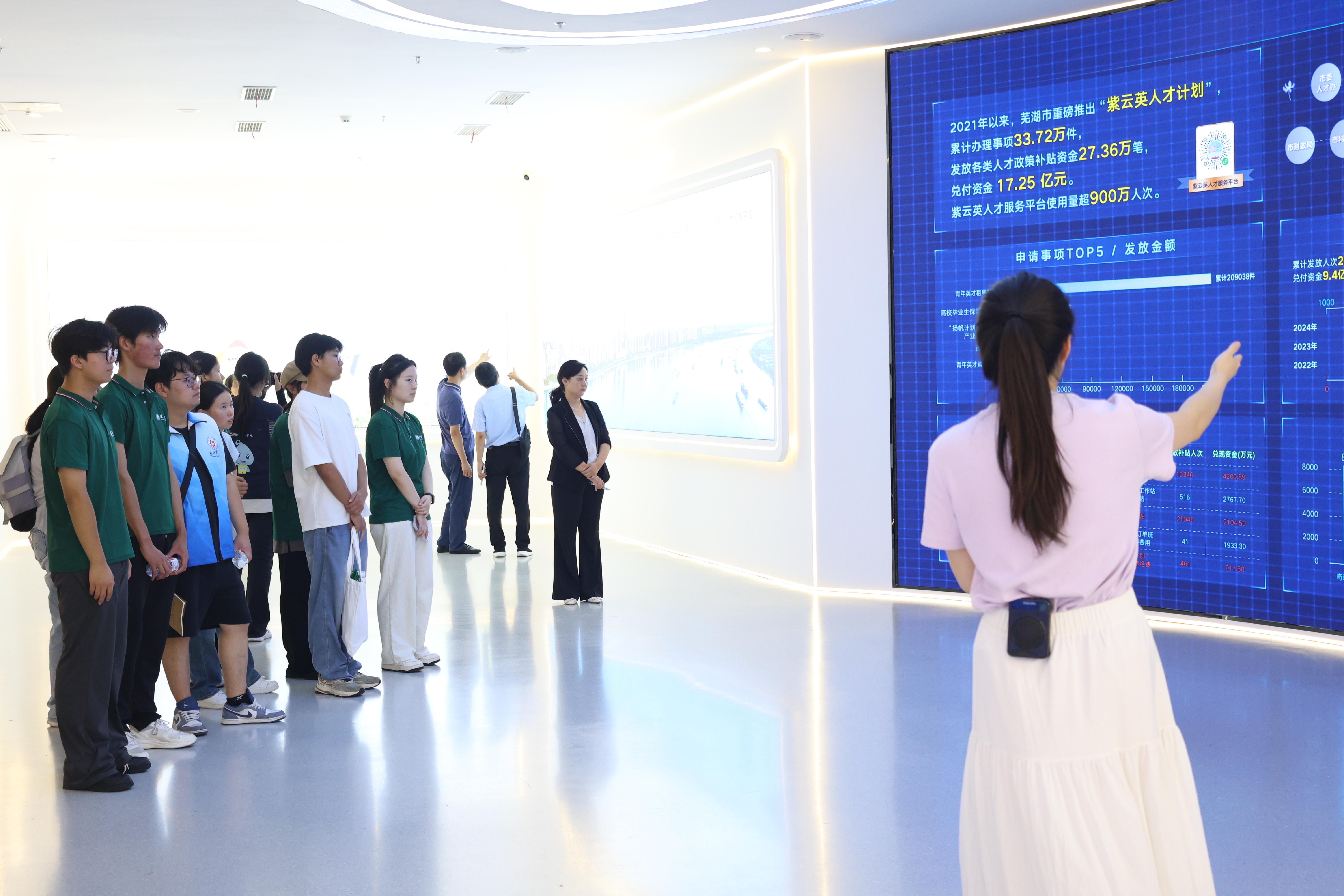 师生深入芜湖市人才服务集团、新安人才网探寻就业市场“人才密码”。芜湖市人才发展集团是省内首家由政府主导、市场化运作的人才发展集团,师生与工作人员开展座谈交流,深入了解当地人才政策及实施情况,特别是“紫云英”人才政策和线上服务平台的高效运用令同学们印象深刻,实践团成员陈可米感慨道:“芜湖人才政策非常完善,当地的生活环境也很吸引我,将来会把芜湖作为就业的目的地之一。”作为省内成立最早、规模最大的人力资源网站,新安人才网服务企业数万家,多年来深耕校园招聘市场,公司负责人与同学们分享了全省不同产业人才需求态势和我校毕业生近3年薪资水平、应聘岗位类型等相关就业数据,为同学们了解就业市场提供了宝贵数据,也激励着同学们以就业为目标,做到早规划、早准备。