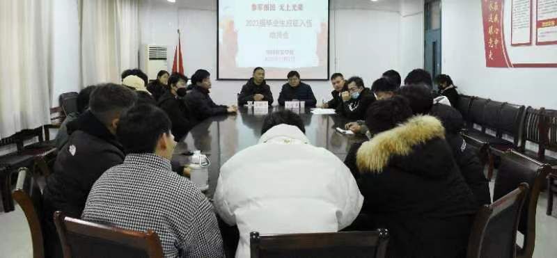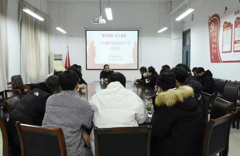 风华正茂恰少年,参军报国正当时。2023年春季征兵已正式开启,为积极响应国家征兵工作号召,激发大学毕业生参军入伍的热情,努力营造“携笔从戎 报效祖国”的浓厚氛围,12月7日中午,教师教育学院在艺术楼西105会议室召开2023届毕业生应征入伍动员会。会议邀请校党委学生工作部、武装部副部长丁继勇作大学毕业生参军入伍政策解读,学院党委书记朱玉票出席会议,学院毕业班辅导员、2019级全体男生参加动员会。会议由学院党委副书记左劲中主持。