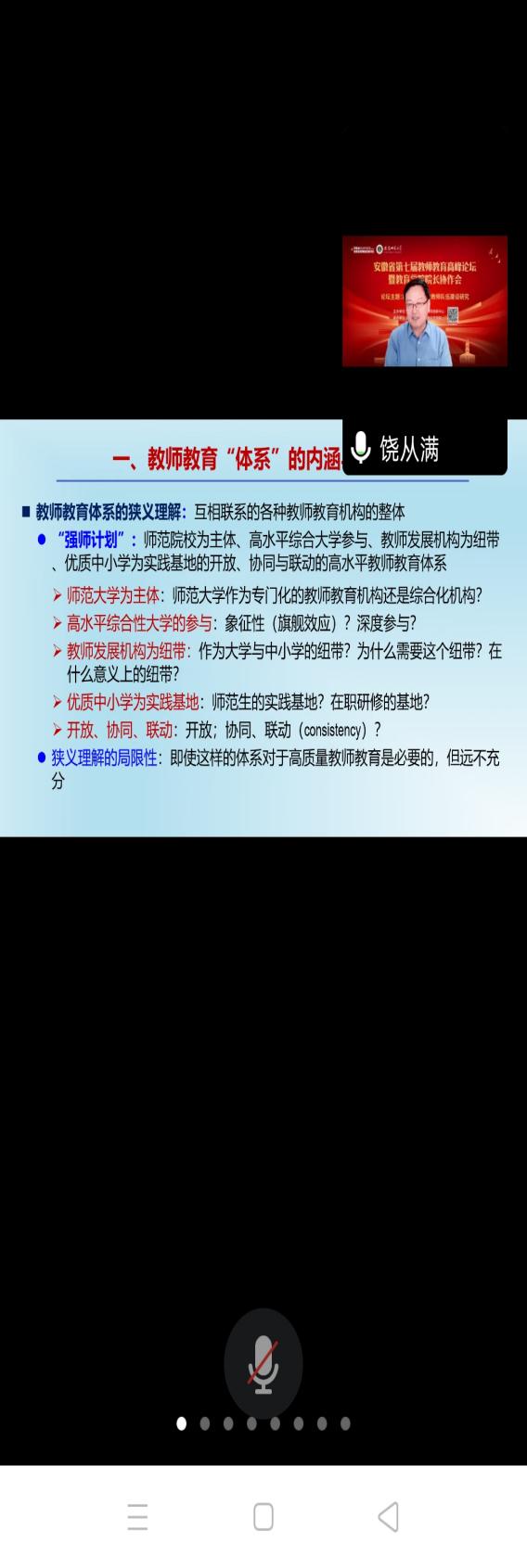 会议议程分两部分,第一部分议程是教师教育高峰论坛的报告交流会,由安徽师范大学教育科学院院长李宜江支持,东北师范大学国际与比较教育研究所的饶从满教授线上做了“比较视野下高水平教师教育体系建设的内涵与课题”,分别从教师教育体系的内涵、高水平教师教育体系建设的课题以及师范类专业认证标准等方面提出了自己的思考,北京师范大学博士生导师宋雈教授做了“互联网+循证教师教育模式与高层次教师培养”的主题讲座,其他学者也做了相关主题发言。