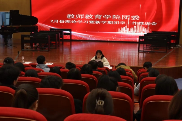 为高效有序推进新学期团学工作,进一步提升团学骨干政治理论水平,2月28日下午,教师教育学院团委在艺术楼报告厅召开2月份政治理论学习暨新学期团学工作推进会,学生兼职团委副书记、各学生组织主要负责人及各部门负责人参加会议,本次会议由学院团委副书记汤重主持。