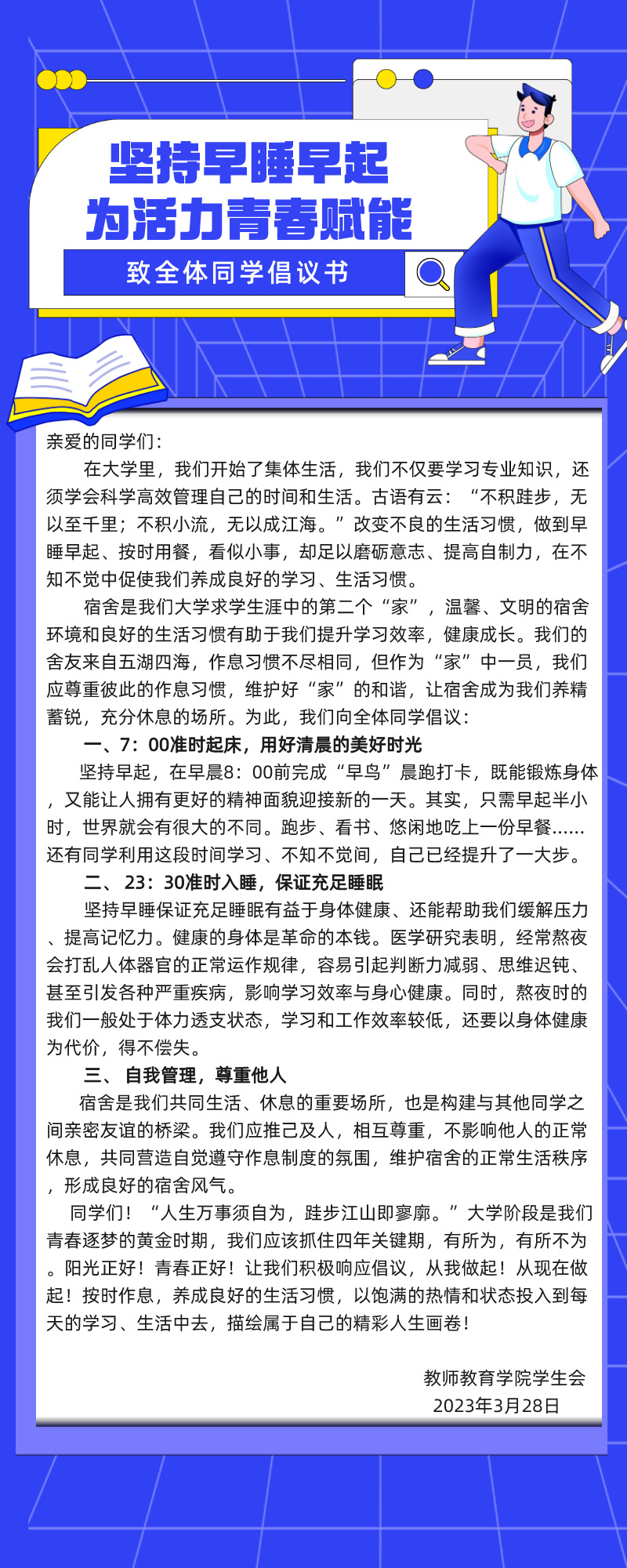 坚持早睡早起,为活力青春赋能——致全体同学倡议书