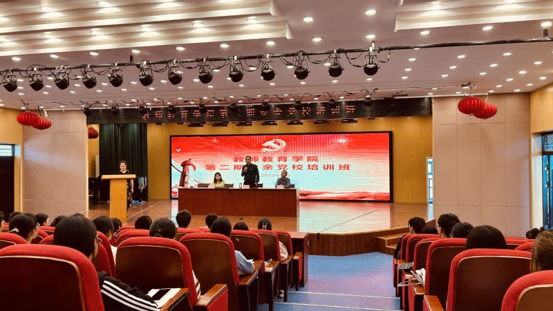 为全面学习贯彻党的二十大精神,教育引导学生系统学习马克思主义基本理论,牢固树立共产主义远大理想,深入学习党的知识与理论,深刻认识党的性质与宗旨,自觉成长为中国特色社会主义事业的合格建设者和接班人,2023年5月4日中午,教师教育学院第二期业余党校在艺术楼报告厅隆重开班。学院党委书记朱玉票、党委副书记左劲中、学生支部书记汤重及56名入党积极分子、20名预备党员参加了开班典礼,开班典礼由学院兼职组织员刘杨主持。