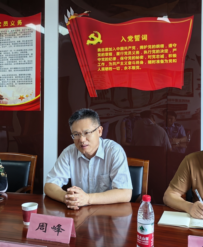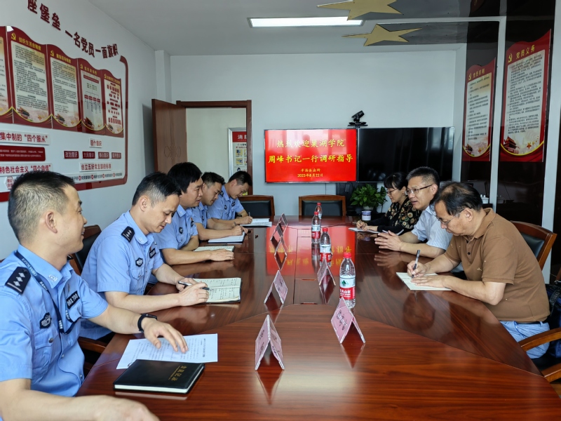 周峰一行首先前往半汤派出所,派出所所长郭建峰、教导员朱义勤、副所长欧阳等警官对访问组一行的到来表示热烈的欢迎,并详细介绍了所里的基本情况,在参观了半汤派出所指挥中心、办事大厅等地后,双方召开了座谈会。会上,郭建峰就派出所不断致力于社区治安工作的改进、构建多部门联合执法机制等涉及人民群众切身利益的方面的工作进行了介绍。郭建峰还重点谈到与必赢76net官网的合作共建,例如防范电信诈骗方面,派出所领导及社区民警深入校园、深入班级,开展法律法规、防诈技巧等宣传,并希望利用“开学第一课”等关键形式持续参与并做好在校学生的防诈工作。