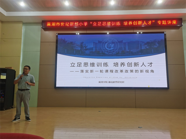 8月27日,教师教育学院吴兵老师应邀在巢湖市世纪新都小学做了主题为《立足思维培训,培养创新人才——落实新一轮课程改革政策的新视角》的讲座。世纪新都小学全体教师参加此次讲座。