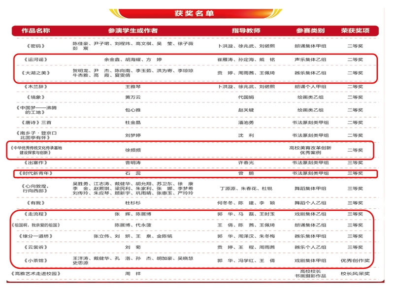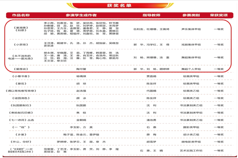 经师生共同努力,在省级决赛中,伍和友、杜珊珊、王佩琦老师指导的声乐集体甲组作品《巢湖美》《如愿》,郭华、冯学红、王倩老师指导的戏剧集体甲组作品《小茶馆》,刘杨、熊珊珊、汤重老师指导的舞蹈集体甲组作品《永不消失的电波——晨光曲》,郭华、刘杨、顾婷婷老师指导的舞蹈个人甲组作品《爱莲说》4件作品获艺术表演类一等奖,其中《小茶馆》另获优秀创作奖;崔雁涛、孙定海、戴铭指导的声乐集体乙组作品《运河谣》,贡婷、周雨茜、王佩琦老师指导的器乐集体乙组作品《大湖之美》2件作品获艺术表演类二等奖;徐频频老师的《中华优秀传统文化传承基地建设探索与创新》获高校美育改革优秀案例二等奖;郭华、马磊、王时玉老师指导的戏剧集体乙组作品《走流程》,王倩、 陈茜、王佩琦老师指导的朗诵集体乙组作品《祖国,我亲爱的祖国》,郭华、周泽汉、朱冬梅老师指导的器乐集体甲组作品《缘分一道桥》,贡婷、王程、周雨茜老师指导的器乐个人乙组作品《云裳诉》,曾鹏老师指导的书法篆刻类甲组作品《时代新青年》等5件作品获三等奖。