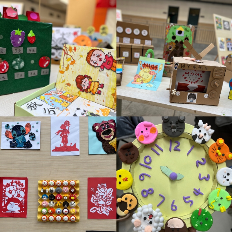 本次活动是课程作品展,亦是应用型课程开发与建设项目《学前儿童玩教具制作》的阶段性成果。基于师范专业认证理念与要求,课程教学中以理论知识为基础,以职业能力为导向,提高学生运用所学知识解决实际问题的能力。本次展览中,60%的作品为单项材料玩教具,如折纸、剪纸、衍纸等纸类作品,“蛋糕”“鲜花”“火锅”等泥材料作品等,一项项精美的单项材料玩教具的制作展现了学前专业学生扎实的基本手工知识和技能。同以往的课程作品展相比,本次展览增加了综合玩教具的数量比例,共有30余件。如“认识天气”“读懂表情”“感受四季”“玩转数字”“我会五子棋”等游戏化的教育教学教具材料,还有“烧烤店”“绘本电视台”“斜挎背包”等废旧材料综合作品。综合玩教具大多为小组合作完成,同学们构思设计、分工规划,将保教知识融入到手工制作项目当中,体现了专业特色与教学能力。