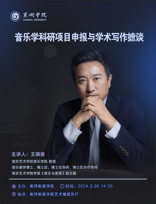 为促进学院学科建设和科研工作高质量发展,进一步提高广大教师的科研学术水平。326日-27日,教师教育学院诚邀南京艺术学院音乐学院院长、音乐美学博士生导师,博士后合作导师,南京艺术学院学报《音乐与表演》副主编王晓俊教授来我院作学术讲座。教师教育学院副院长(主持工作)蔡广、副书记兼音乐系主任左中、音乐表演专业负责人顾婷婷以及音乐系全体教师和学生代表参加了此次讲座。