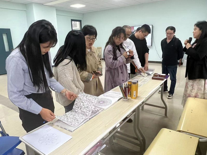 在团体辅导室,袁蕙通过视频为参观者们展示了我校心理健康教育中心开展的心理健康教育团体辅导活动,详细介绍了心理咨询OH卡技术、曼陀罗绘画心理技术,并带领老师们体验了齐心协力。