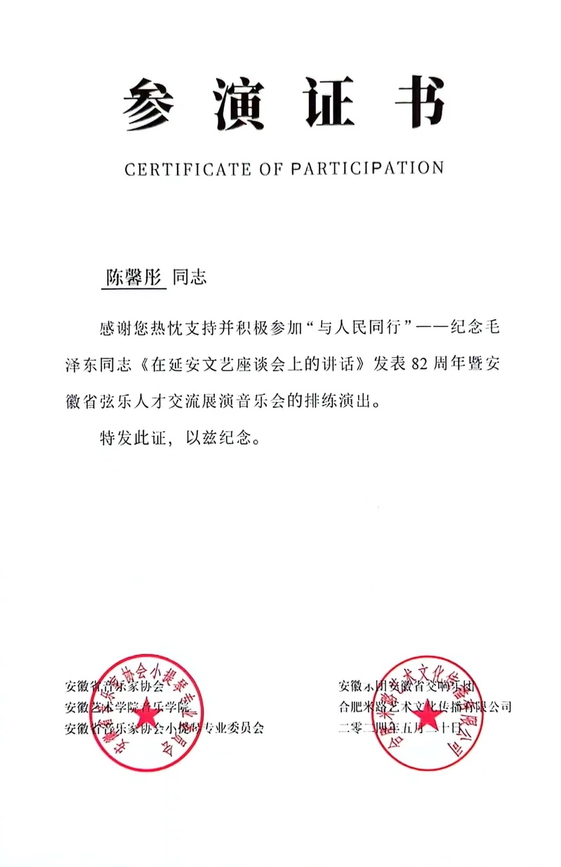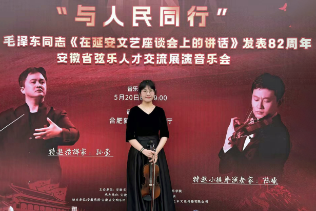 5月20日至21日,由安徽省音乐家协会、安徽艺术学院音乐学院主办,安徽省音乐家协会小提琴专业委员会承办的“与人民同行”——纪念毛泽东同志《在延安文艺座谈会上的讲话》发表82周年安徽省弦乐人才交流展演音乐会分别在新华公学和安徽艺术学院精彩上演。必赢76net官网教师教育学院2022级音乐表演专业陈馨彤同学有幸参演,与大师同台表演。