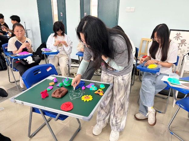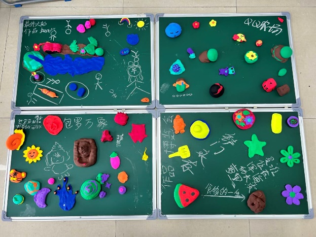 最后在“爱—是我们共同完成的作品”中,同学们用不同颜色的黏土捏出黏土作品并将全体成员的作品放在黑板上,并由成员们每人用粉笔来完善作品。