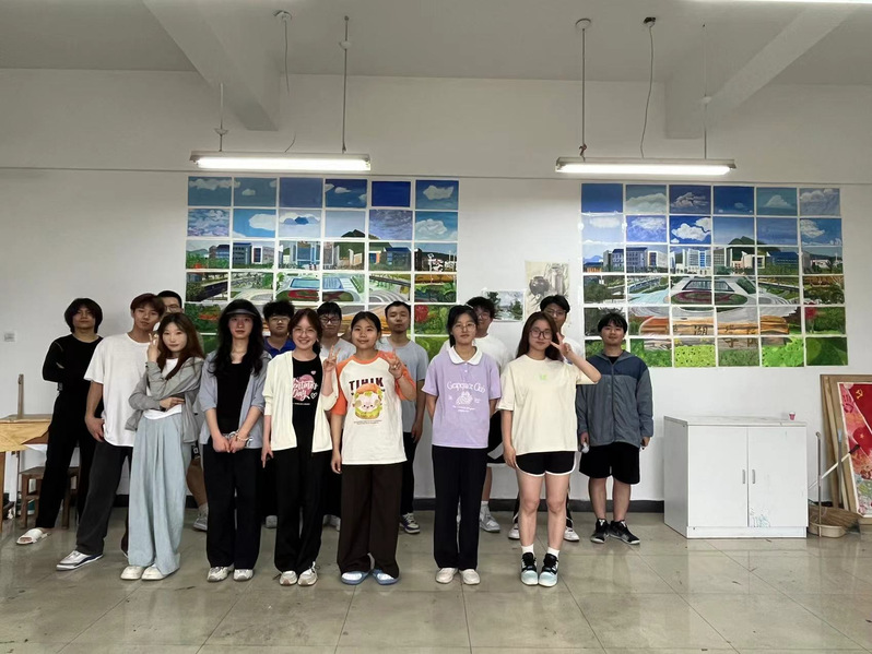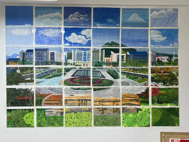任课教师曾鹏选取一张校园景色全貌,分割多份布置任务,要求每位同学描绘校园全貌的一角,最后集体拼接,呈现出艺术与自然相融合的美丽校园。此项任务让每位学生都参与其中,在绘画中既培养学生对画面的整体观察与局部描绘的能力,也展现出学前教育学子们青春勃发的精神风貌和浓浓的爱校之情。