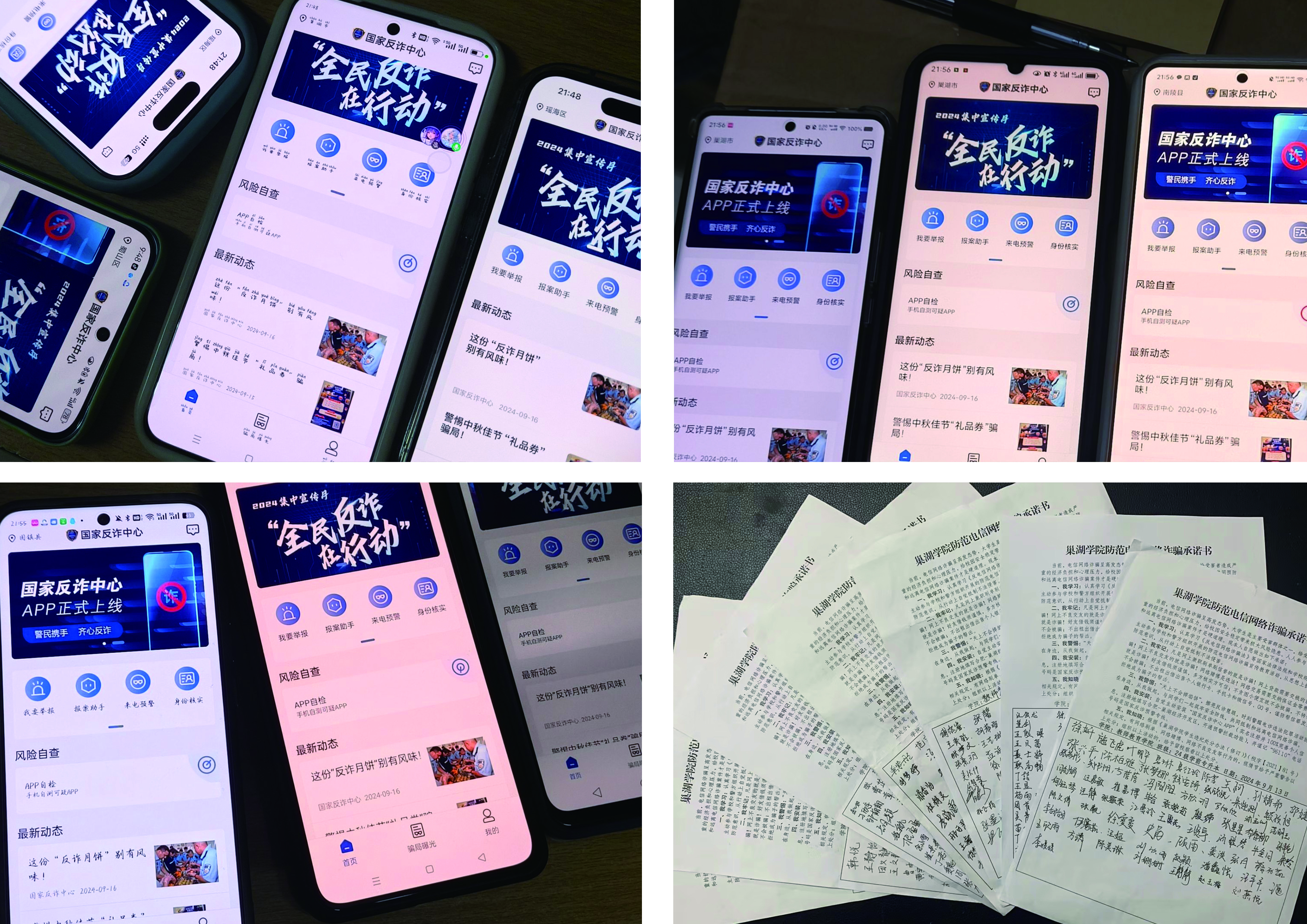 全员在行动,网格化管理。学院构建“学院-班级-宿舍”全员反诈机制,为每个班级配备了反诈预警劝导员,多措并举,加强反诈宣传教育网格化管理。结合涉及大学生受骗真实案例,走进教室、宿舍,加强警示教育;以班级为单位,组织每位学生下载安装国家反诈中心APP,签订防范电信网络诈骗承诺书;9月13日,开展“全民反诈在行动”活动。向同学们宣传网络诈骗常见手段,让大家深刻认识到网络诈骗的隐蔽性和危害性,提醒学生要时刻保持警惕,不随意转账、不随意点击不明链接以及不向陌生人透露个人信息和银行卡密码等重要内容。