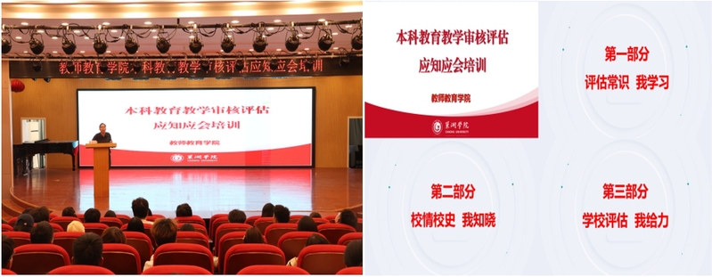 为帮助学生全面准确把握新一轮本科教育教学审核评估内涵与要求,以主人翁的态度责任和良好的精神风貌迎接审核评估、参与评估,教师教育学院面向全院学生开展本科教育教学审核评估应知应会专题培训。