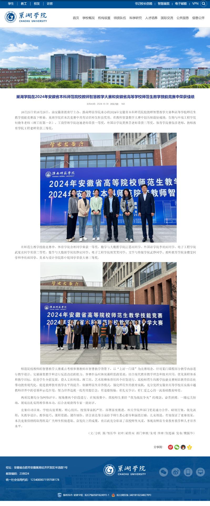 祝贺我院青年教师王程博士在2024年安徽省本科师范院校教师智慧教学大赛中荣获三等奖!