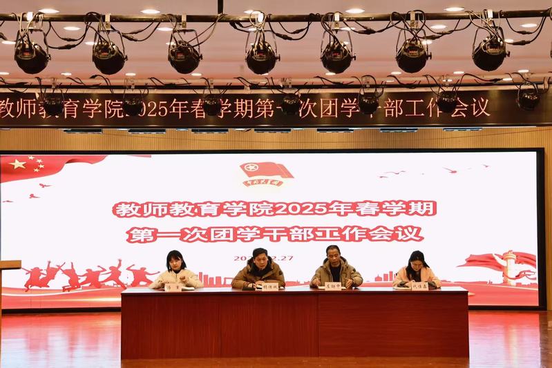 2025年2月27日下午,教师教育学院2025年春学期第一次团学干部工作会议在艺术楼报告厅举行。学院党委副书记胡传双、左劲中,团委副书记汤重、团委挂职副书记代佳鑫及全体团学干部齐聚于此,共同擘画春学期团学工作新蓝图。