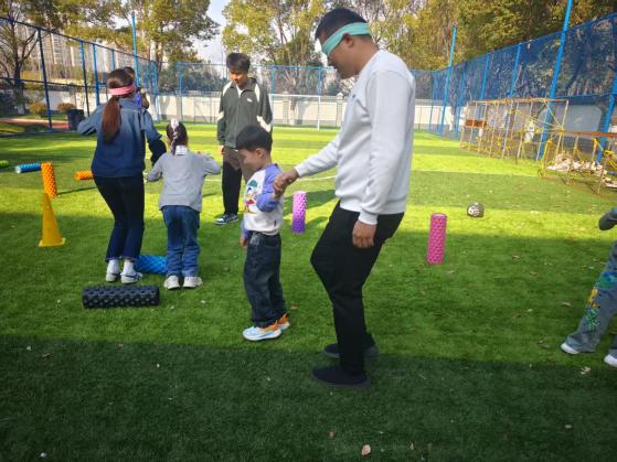 活动伊始,在王芸芸老师的带领下,启明星心理协会的志愿者们熟悉活动流程并进行现场布置。本活动是以“家是最坚强的后盾”为核心理念,精心设计了四大主题游戏模块。在“亲子盲行”环节中,家长与孩子通过蒙眼引导完成障碍穿越,一位消防员父亲分享道:“平时总在火场指引方向,今天被孩子的声音牵着走,突然发现他已经能成为我的眼睛了。”而“两人三足亲子飞舞”项目则让家庭成员在绑腿协作中感受默契养成,现场不时传出欢快的笑声。